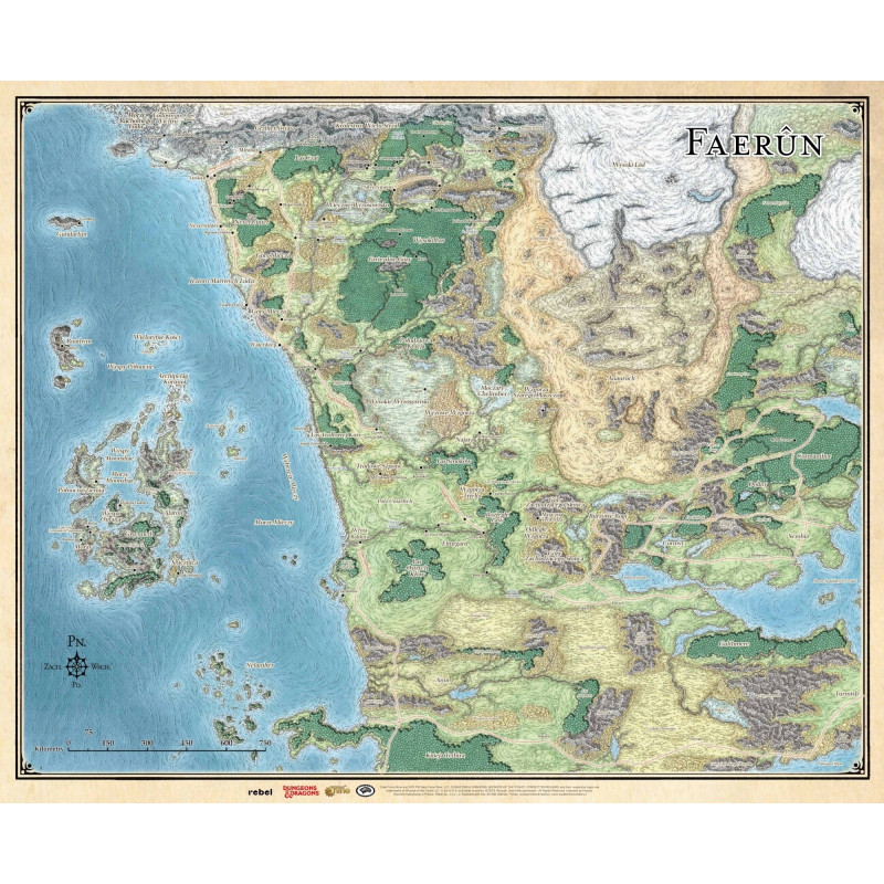 Duża, dokładna mapa Faerunu - jednego z najbardziej znanych miejsc świata Zapomnianych Krain - miejsca rozgrywki większości przygód w piątej edycji Dungeons & Dragons! Znajdziecie na niej najważniejsze miejsca Wybrzeża Mieczy - Waterdeep, Wrota Baldura czy Neverwinter. I wszystkie w polskiej wersji językowej!