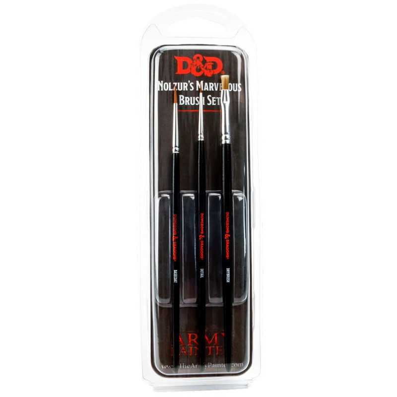 Zestaw trzech pędzli z serii D&D Nolzur's Marvelous, idealnie przygotowanych do wykonywania różnych zadań:   'detail' do odwzorowania nawet najmniejszych wzorów na figurce 'basecoat' do pokrycia dużej powierzchni jednym pociągnięciem pędzla 'drybrush' do nadania trójwymiarowości i głębi