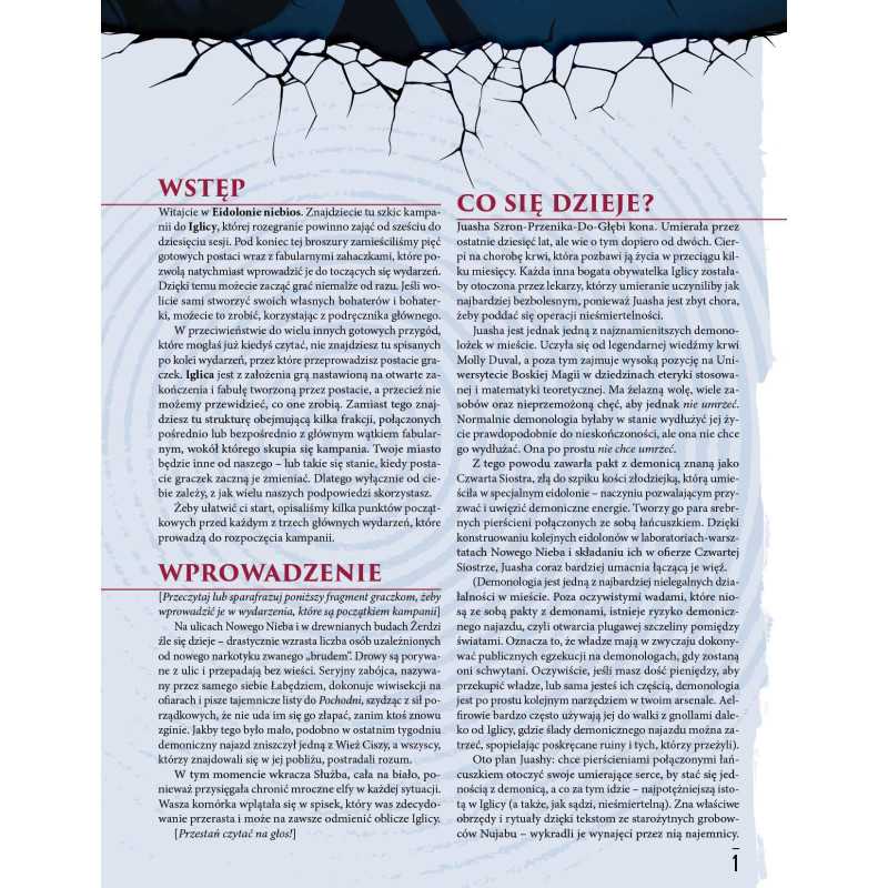 Iglica: Eidolon niebios to zbiór podpowiedzi, sugestii, stronnictw, gotowych postaci i osobowości, które graczki oraz mistrzynie gry mogą dowolnie wykorzystywać, tworząc wielki okultystyczny spektakl, który zadecyduje o przyszłości miasta.