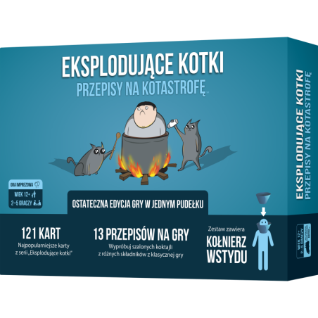 Eksplodujące Kotki to kultowy projekt wśród gier oryginalnie wydanych przez kampanie crowdfundingowe. W 2015 roku ponad 219 000 osób wsparło to miauczące szaleństwo! Jeśli kochasz gry pełne negatywnej interakcji i złośliwych zagrywek, to zabawa dla Ciebie. Na szali leży odpadnięcie z gry, więc zawsze walczycie o wysoką stawkę! W tym pudełku znajduje się zbiór najlepszych kart z gier Eksplodujące kotki, Implodujące kotki, Frywolne kotki i Szczekające kotki. To surowe składniki, dzięki którym spróbujecie rozgrywek na 13 nowych sposobów. Chcecie zagrać partię, która potrwa tylko 2 minuty? Jest na to przepis. Macie smaka na wariant, w ramach którego będziecie szpiegować innych graczy? Taki przepis też zgotowaliśmy. W pudełku znajdziesz kołnierz wstydu! Otrzymuje go ten, kto jako pierwszy zapomni, czyja jest tura. Od tej pory będzie ludzkim sygnalizatorem kierunku przebiegu tur.