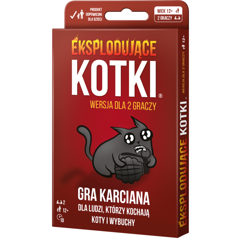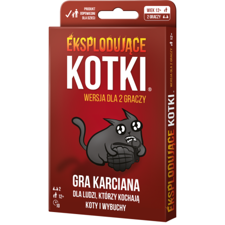 Eksplodujące Kotki to kultowy projekt wśród gier oryginalnie wydanych przez kampanie crowdfundingowe. W 2015 roku ponad 219 000 osób wsparło to miauczące szaleństwo! Jeśli kochasz gry pełne negatywnej interakcji i złośliwych zagrywek, to zabawa dla Ciebie. Na szali leży odpadnięcie z gry, więc zawsze walczycie o wysoką stawkę! Wersja dla 2 graczy to pojedynek o przetrwanie, w którym macie tylko jeden cel: pokonać przeciwnika! Obiektem Waszych ataków zawsze jest tylko jedna osoba, ale sami też musicie bezustannie się bronić, więc rozgrywka jest bardzo intensywna.