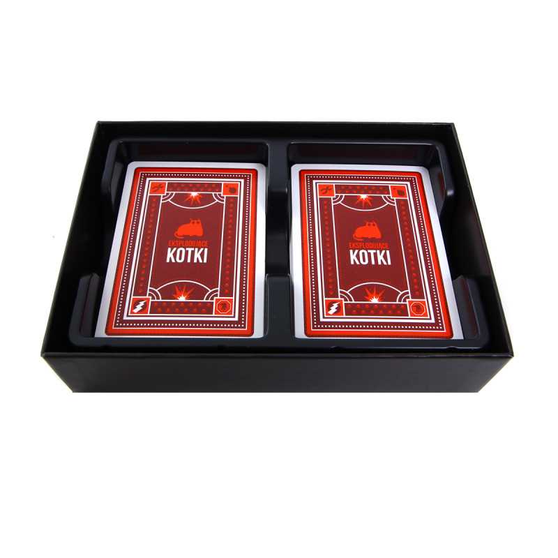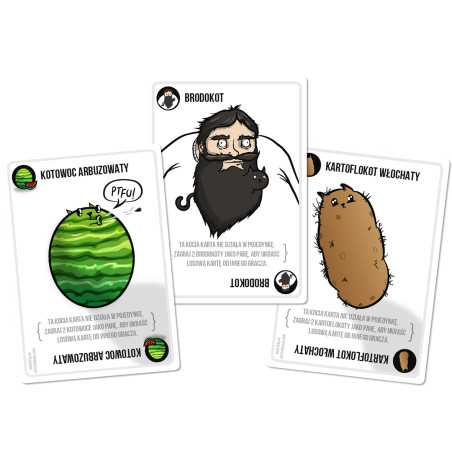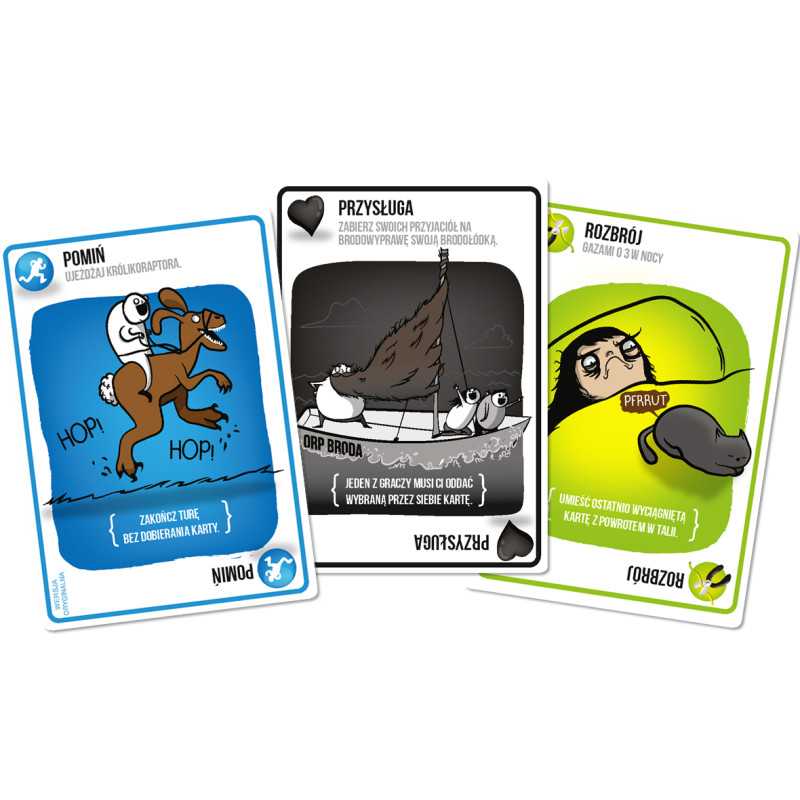 W talii znajduje się kilka eksplodujących kotków. Aby zagrać, połóżcie ją rewersami kart do góry i kolejno ciągnijcie karty do momentu, aż ktoś z Was dobierze eksplodującego kotka. Osoba, która na niego trafi – wybucha. I już do końca gry pozostaje martwa. Przy okazji możecie zagrywać różne karty odwracające uwagę eksplodujących kotków.