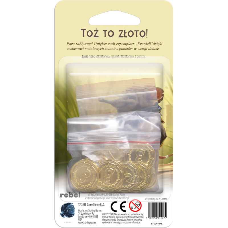 Już dziś rozszerz swoją kolekcję wyjątkowych akcesoriów i zastąp standardowe znaczniki punktów zwycięstwa zestawem metalowych monet! W połączeniu z dopracowaną stylistyką i wysoką jakością wykonania elementów podstawowych Everdell, stanowią one ciekawy dodatek podnoszący przyjemność z gry.