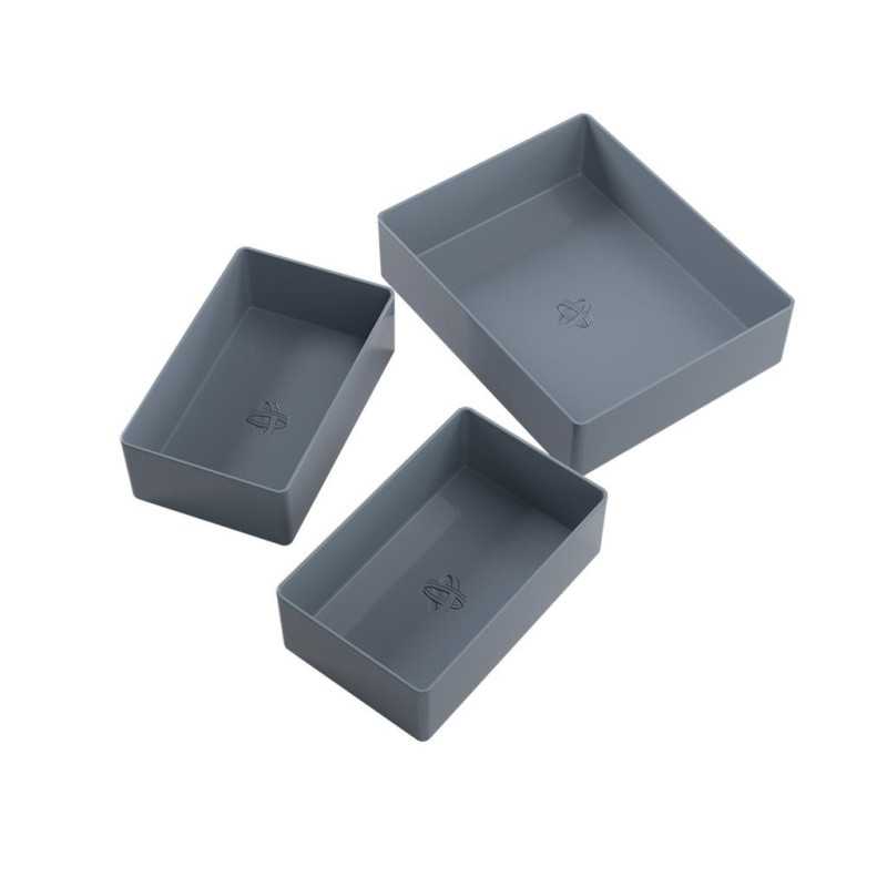 Pojemniki możesz mieszać i wymieniać tak, aby stworzyć unikalną kombinację dopasowaną do Twoich osobistych potrzeb. Możesz przechowywać w nich różnorodne żetony, karty, kości i inne przydatne elementy gier planszowych i RPG. Są one pomocne do przechowywania większej ilości kart. Duży pojemnik pomieści 40 kart formatu CCG zakoszulkowanych pojedynczo lub 75 kart bez koszulki (64 mm x 89 mm), a mniejszy 45 zakoszulkowanych kart formatu Mini-American lub 65 kart bez koszulki (42 mm x 65 mm).