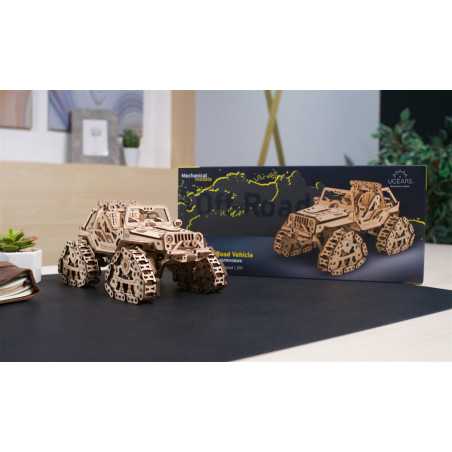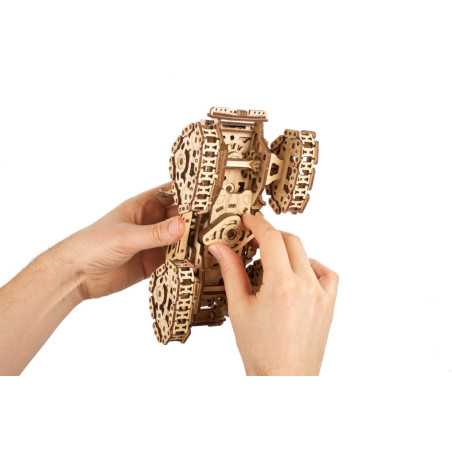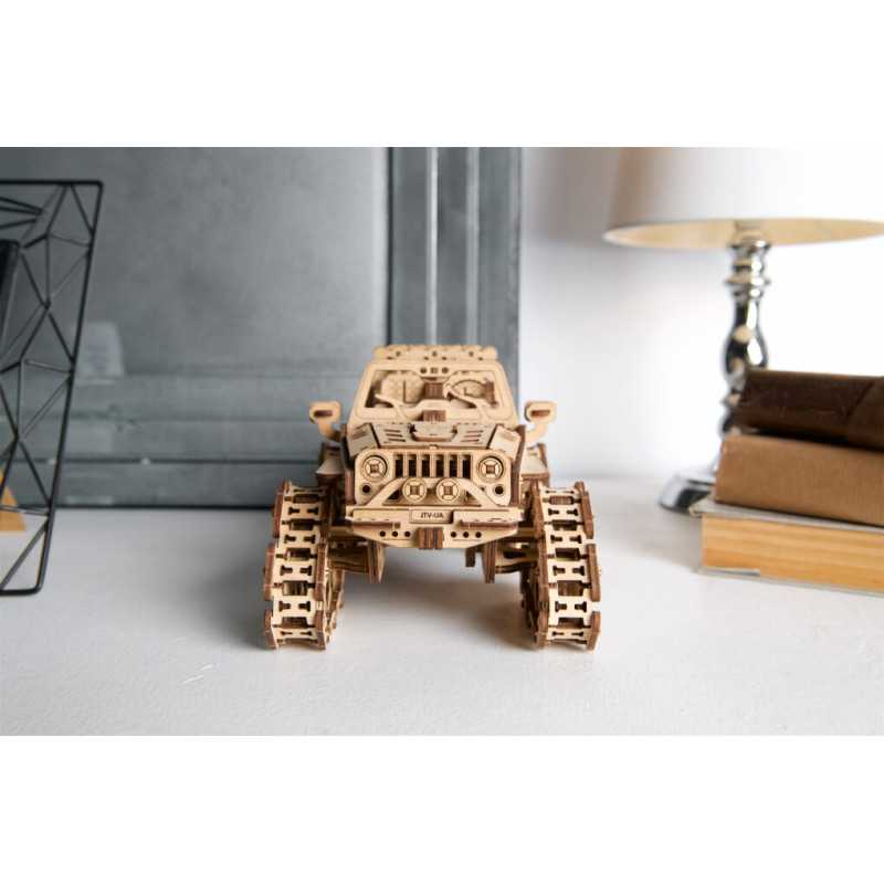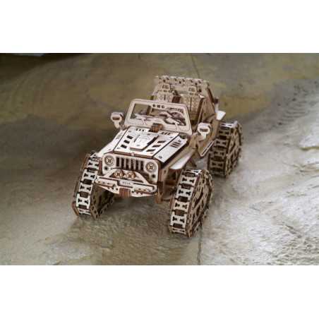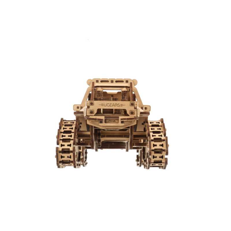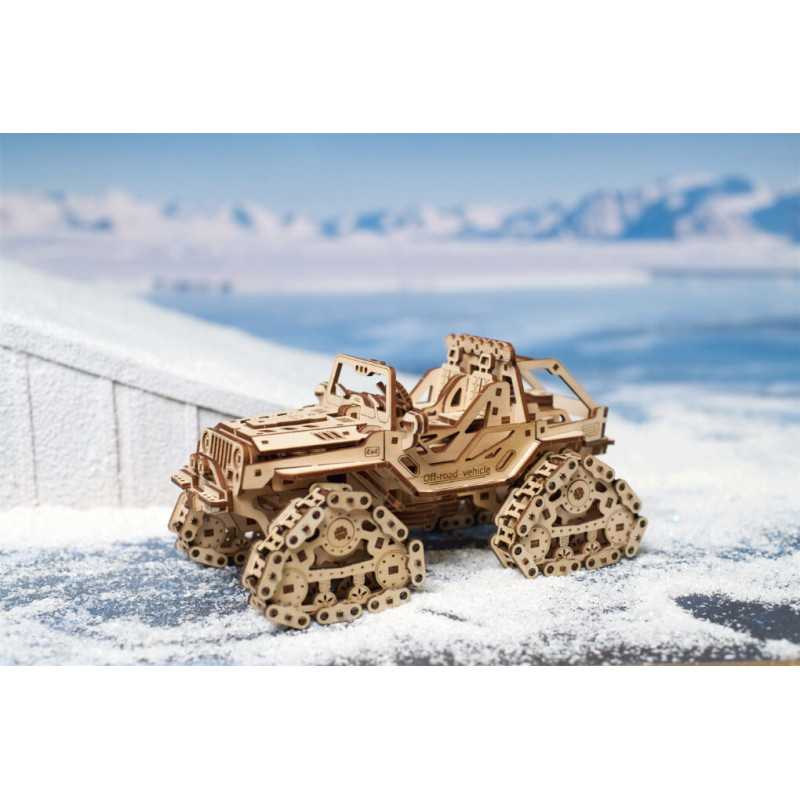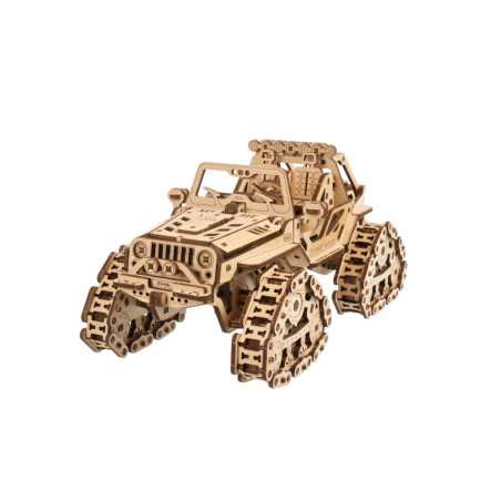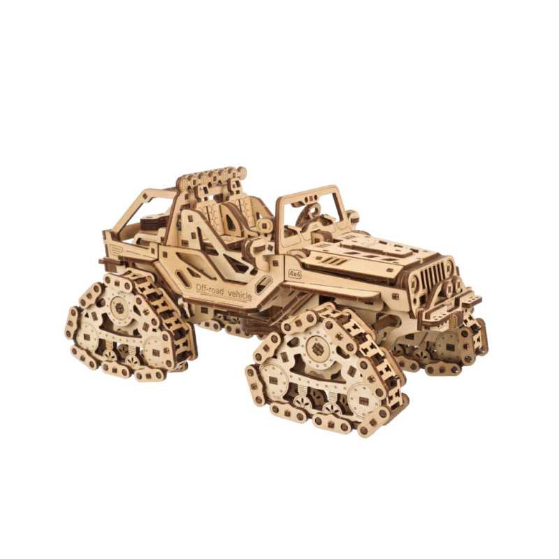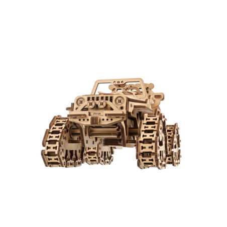Wyobraź sobie auto zdolne pokonać każde warunki terenowe. Takie są właśnie pojazdy gąsienicowe, które spotkać możemy zarówno w wojsku, jak i offroadzie. Dostępny w Ugears model drewnianego samochodu terenowego został zaprojektowany z dokładnym odwzorowaniem prawdziwego pojazdu gąsienicowego.