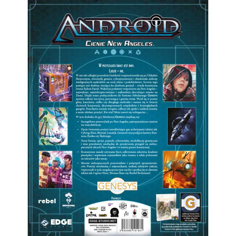 Genesys RPG: Android - Cienie New Angeles to podręcznik do Systemu Fabularnego Genesys, dzięki któremu możesz odkryć żywy, porywający i groźny świat. Wciel się w postać gliny, kanciarza, osiłka czy zbiegłego androida w świecie chciwych korporacji, skorumpowanych urzędników i bezwzględnych gangów. Przechytrz swoich wrogów, odkryj ich spiski i uniknij zemsty, a może zdołasz przeżyć. Kto wie? Może nawet się wzbogacisz…