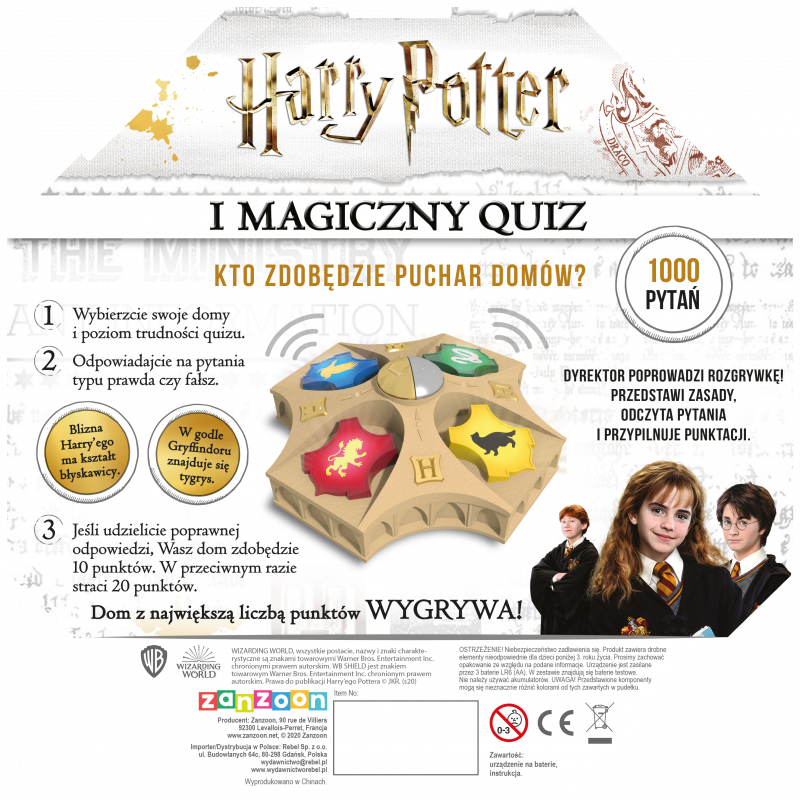 Różdżki w dłoń, jesteście w Hogwarcie! Stańcie w szranki, odpowiadajcie na pytania dotyczące świata Harry’ego Pottera i przynieście swoim barwom chwałę oraz Puchar Domów. Harry Potter i Magiczny Quiz to gra, w której fani opowieści o małym czarodzieju będą mieli okazję zabłysnąć wiedzą na temat znanych bohaterów i wydarzeń. W pudełku znajdziecie mechanizm, który głosem dyrektora Hogwartu poprowadzi Was przez całą rozgrywkę: przedstawi zasady, odczyta pytania oraz przypilnuje przestrzegania reguł. Waszym zadaniem będzie wyłącznie udzielanie odpowiedzi, jednak uważajcie – każda pomyłka będzie Was sporo kosztowała!