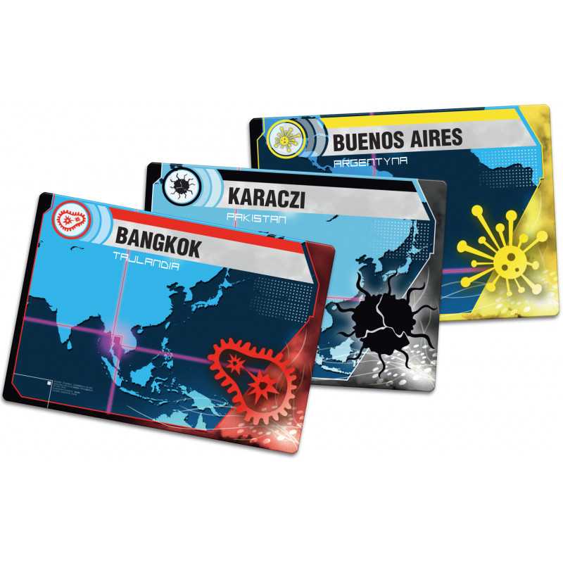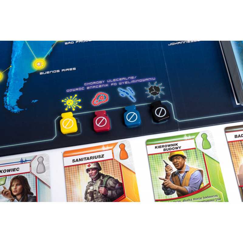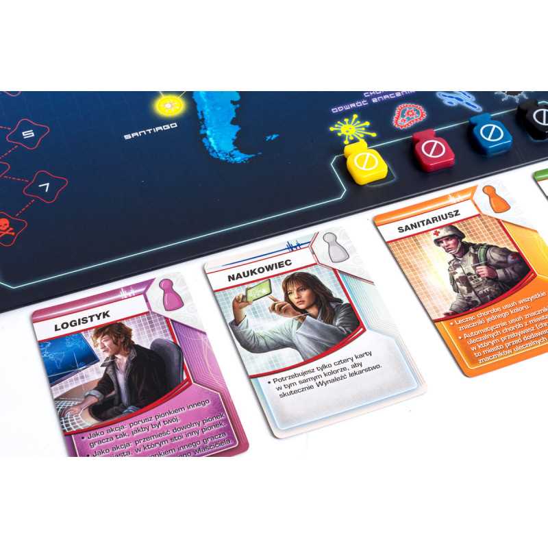Gracze muszą współpracować ze sobą, wykorzystując silne strony swych postaci i dobrze planując strategię, jaką wykorzystają, by pozbyć się chorób, zanim, w serii coraz gwałtowniejszych epidemii, opanują one cały świat. Jakie zdolności posiadają postacie? Kierownik budowy potrafi budować laboratoria badawcze, potrzebne do tego, by wynajdywać szczepionki na choroby. Naukowiec potrzebuje tylko 4 kart konkretnej choroby, by ją wyleczyć, zamiast zwyczajowych 5.