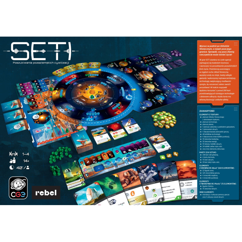 Wciel się w jednego z liderów eksploracji kosmosu i korzystaj z najnowocześniejszych technologii, by odwiedzać inne planety, badać odległe gwiazdy i rozwijać swoje możliwości! SETI: Poszukiwania pozaziemskich cywilizacji to złożona gra ekspercka, w której czeka na Ciebie ponad 200 unikalnych kart technologii opartych na rzeczywistej wiedzy naukowej oraz mnóstwo elementów, dzięki którym w każdej rozgrywce odkryjesz nowe możliwości i drogi do zwycięstwa.