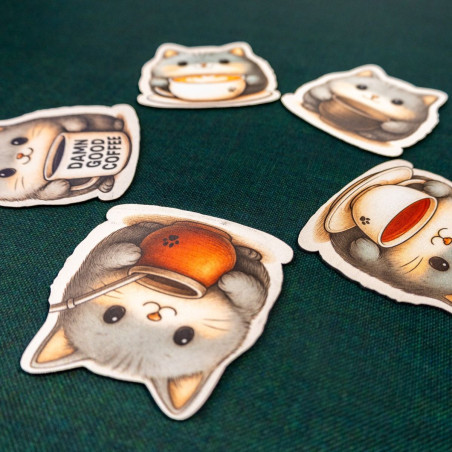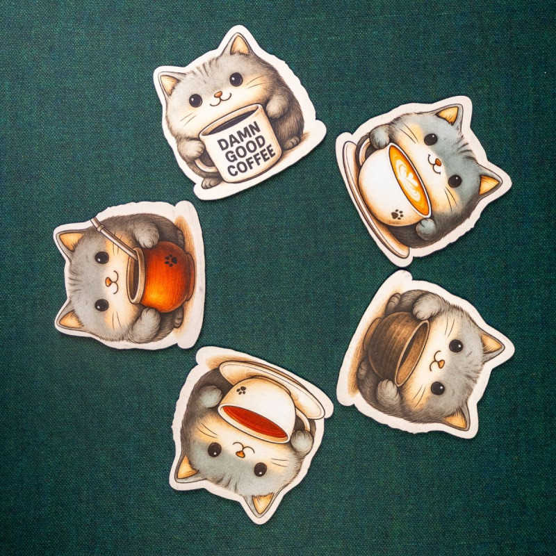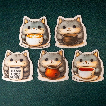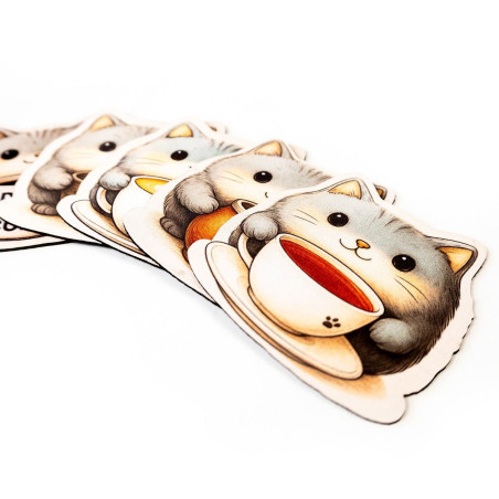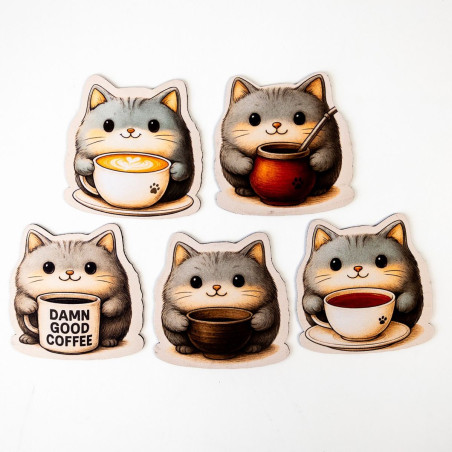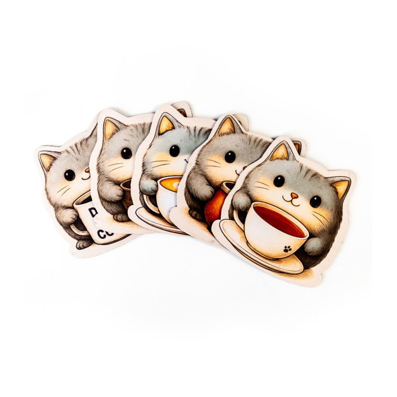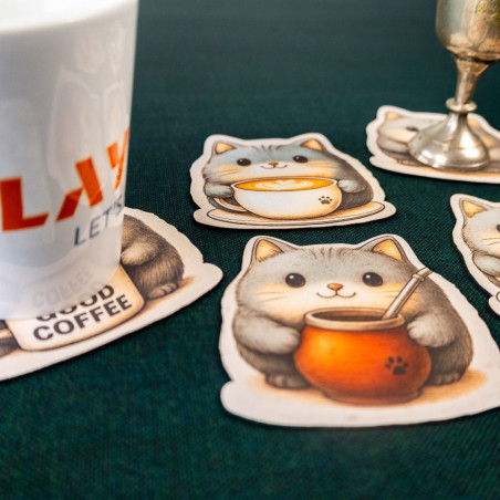 Znasz to uczucie, gdy kawa ląduje na kartach postaci, a herbata zostawia ślad na planszy? Oto antidotum, które nie tylko chroni stół, ale też wywołuje uśmiech. Kotkładki to zestaw pięciu podkładek pod kubek wykonanych z gumy o grubości 2 mm, z jednostronnym nadrukiem przedstawiającym urocze szare kotki, z których każdy dzierży inny napój – od latte z artystyczną pianką, przez yerbę, po mocną czarną kawę z napisem „Damn Good Coffee”.