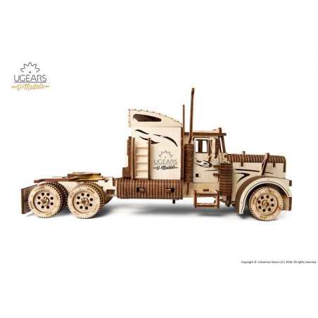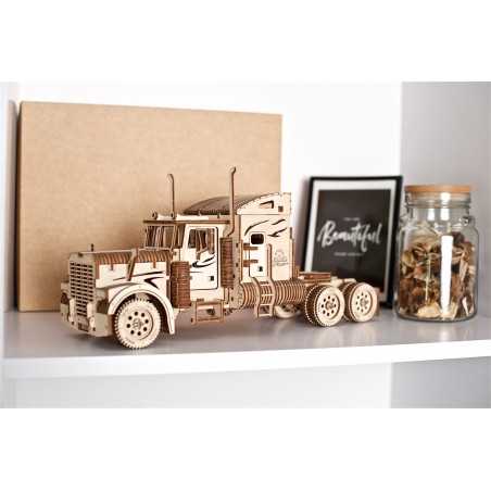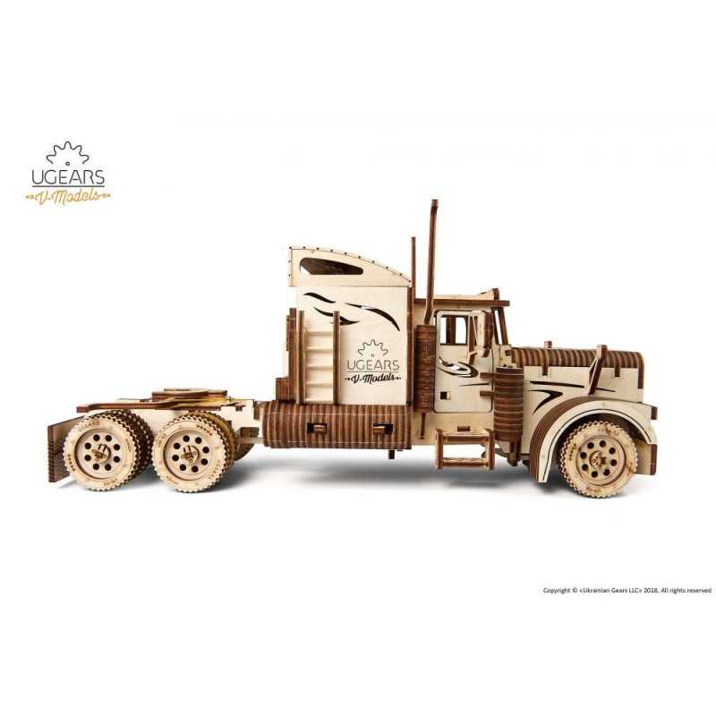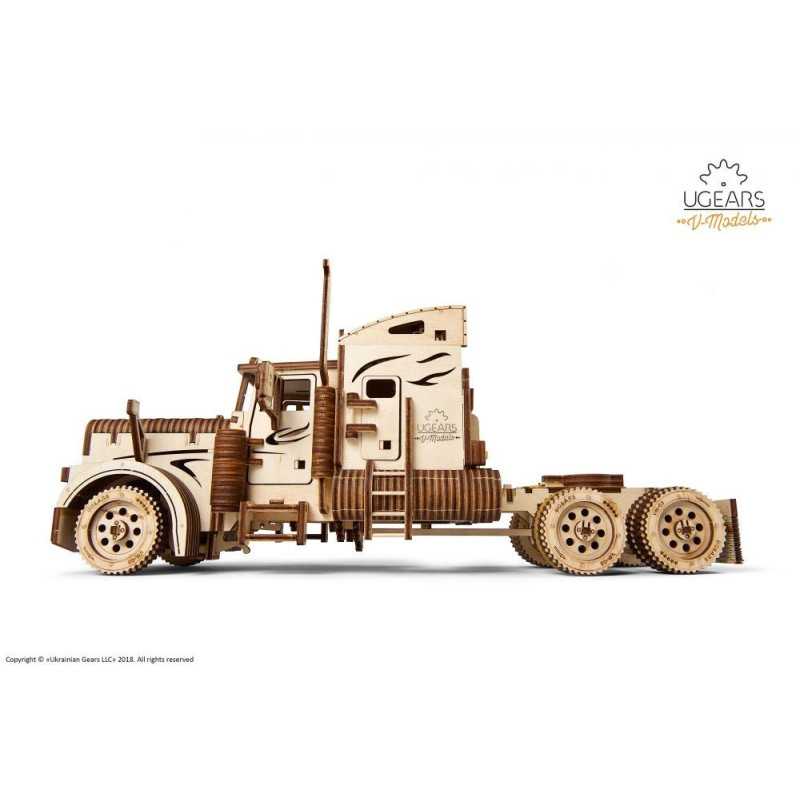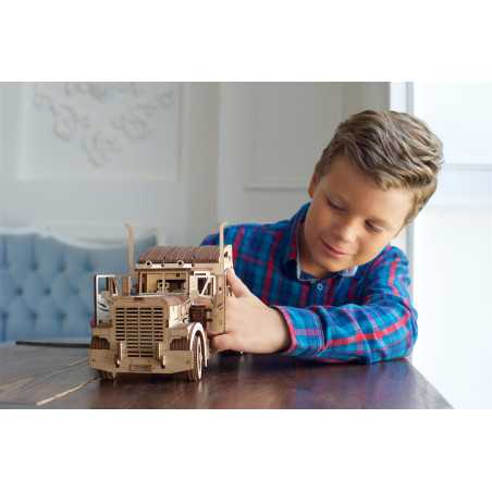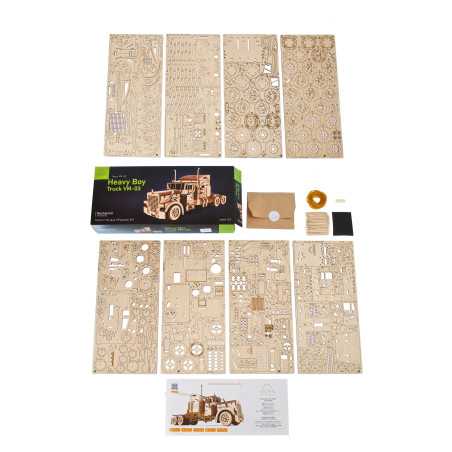 VM-03 to drewniany ciągnik do składania, który w pełni odzwierciedla prawdziwą ciężarówkę. Mało tego — posiada mechanizm, dzięki któremu pojazd się porusza.