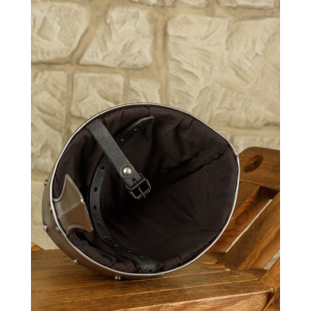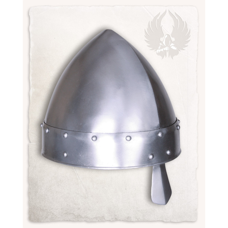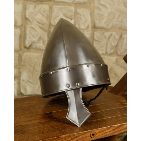 Ten hełm normański wyposażony jest w nosal, który zapewnia dodatkową ochronę twarzy.