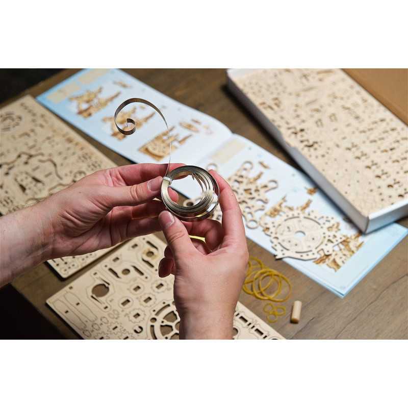 Hexapod Odkrywca składa się z 388 części i zawiera mocną metalową sprężynę, która napędza robota do chodzenia, oraz gumowe nakładki na stopy dla lepszej przyczepności na gładkich powierzchniach. Napędzany potężnym silnikiem sprężynowym, Hexapod Odkrywca może przemieszczać się na własnych nogach na odległość do 3 metrów, bez potrzeby stosowania pomocniczych lub wspierających kółek, jak ma to miejsce w innych modelach. Ten model do majsterkowania jest na poziomie średnim, a czas montażu wynosi około 8 godzin. Wewnętrzna sprężyna jest nawijana za pomocą klucza zapadkowego znajdującego się na brzuchu robota. Dzięki mechanizmowi zapadkowemu nie musisz trzymać klucza podczas nawijania, aby zapobiec poślizgowi – energia potencjalna jest magazynowana z każdym obrotem, bez poślizgu, aż do pełnego obciążenia sprężyny. Hexapod Odkrywca może przemieszczać się po nierównych powierzchniach, a nawet pokonywać przeszkody o wysokości 1-2 cm. Podnieś model, ustaw go, wybierz pożądaną prędkość za pomocą pokrętła na głowie Hexapoda, a następnie zwolnij przełącznik “go” z tyłu, aby wprawić model w ruch. Prędkość można zmienić w każdej chwili, w trakcie lub przy kolejnym uruchomieniu.