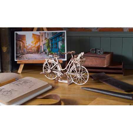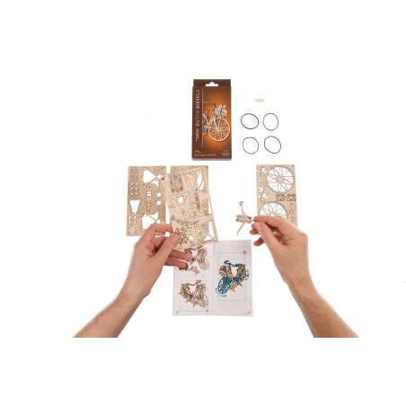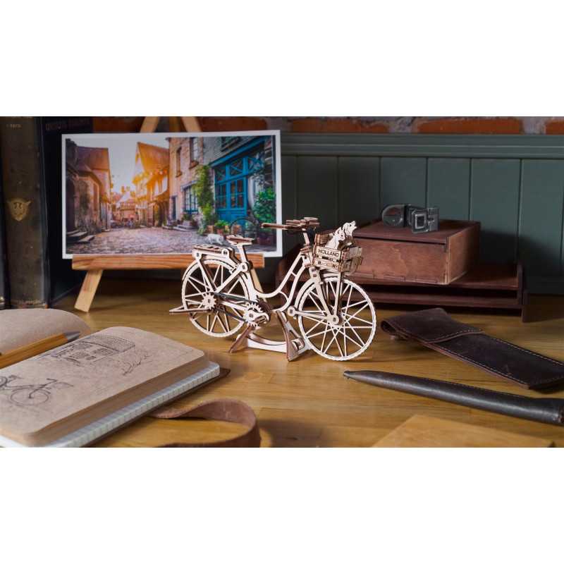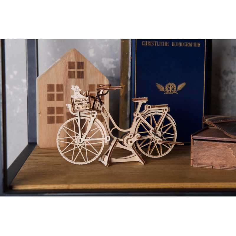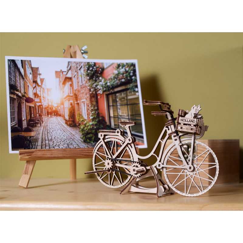 Model roweru holenderskiego UGEARS z kolekcji World Cities to klasyczny rower z tylnym bagażnikiem i przednim koszykiem, na którym można zrobić zakupy lub zabrać przyjaciela lub zwierzaka na przejażdżkę. W zestawie znajdują się małe modele kota, psa i kwiatów, które można umieścić w koszyku. Tylna podpórka i uchwyt umożliwiają ustawienie roweru w pozycji pionowej. Model ma także obrotowe pedały z gumowym łańcuchem napędzającym tylne koło, swobodnie obracające się przednie koło i ruchomą kierownicę. Składający się z 75 elementów wykonanych z drewna kompozytowego o jakości artystycznej, zestaw DIY Holenderskiego roweru jest “łatwy”do złożenia, co można go zrobić w około 90 minut.