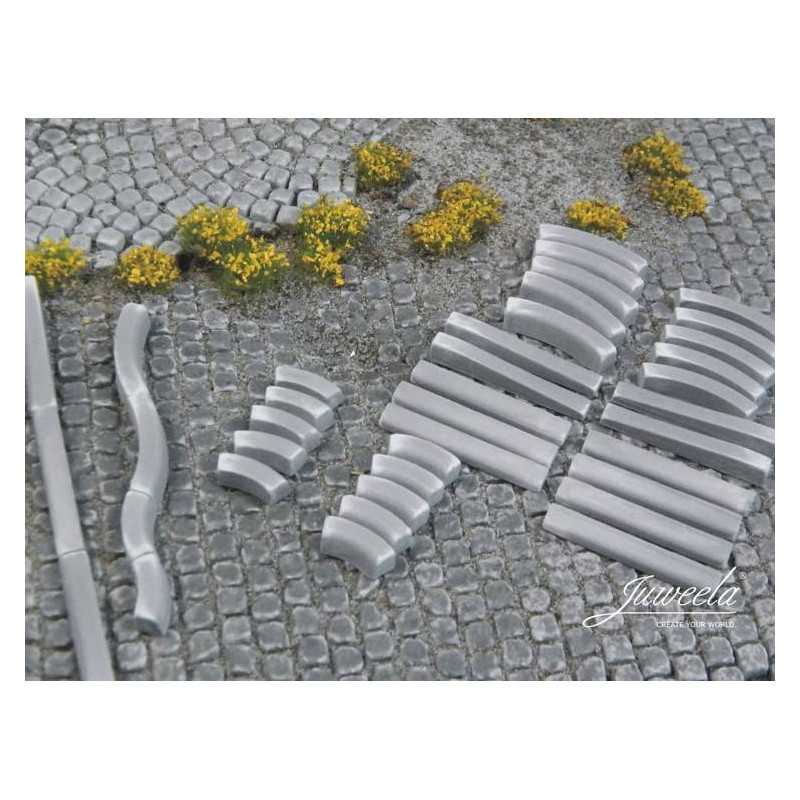 Krawężniki - takie, jakie wszyscy znają. Można je łączyć i indywidualnie uzupełniać o płyty chodnikowe i krawężniki proste. Dobre do stworzenia dioramy miasta w skali 1:32.