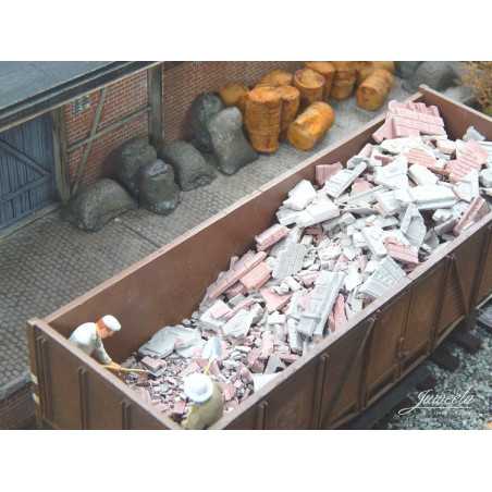 Żaden budynek nie postoi wiecznie. Kiedy po rozbiórce pył opadnie, pozostają tylko gruzy, które trzeba wywieźć. Całe ściany, konkretne elementy, ale też luźne cegłówki odnajdziesz w tym zestawie. Wykorzystaj je w Swojej dioramie w skali 1:45, stawiając z gruzu hałdy, wsypując go na samochody i pociągi lub uzupełnij nim dioramę rozdartego wojną miasta.