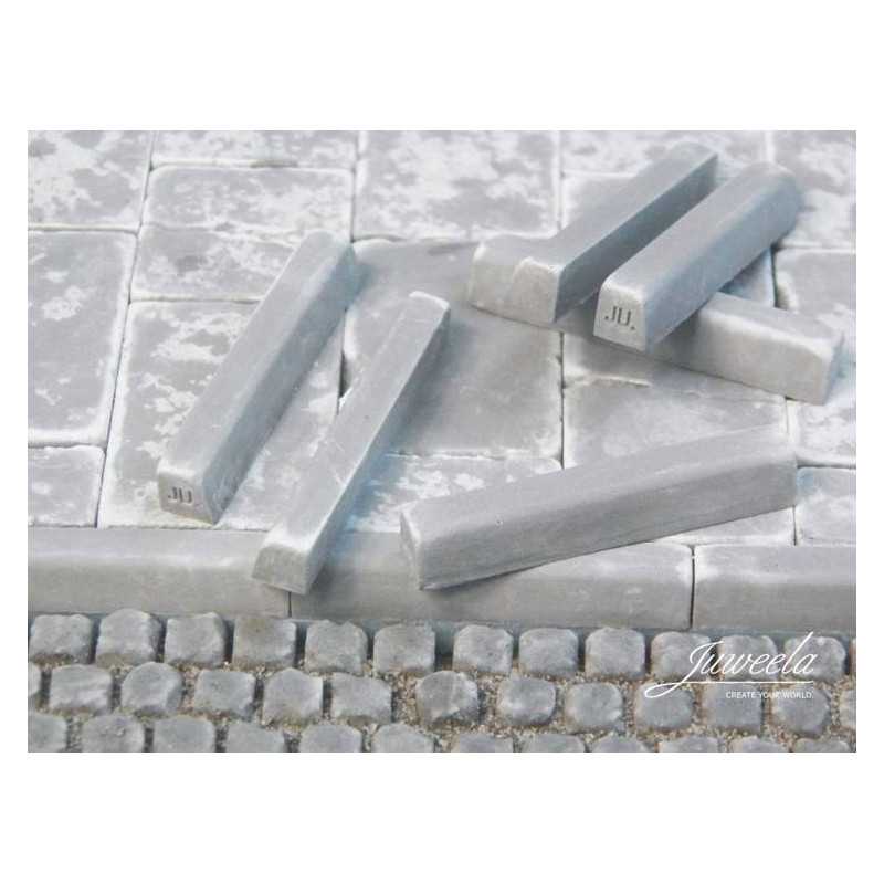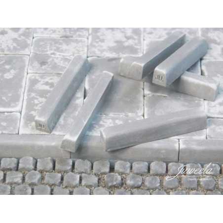 W zestawie otrzymasz dziewięćdziesiąt sztuk szarego krawężnika o wymiarach 3,1x0,5/0,5cm - doskonały do skali 1:35