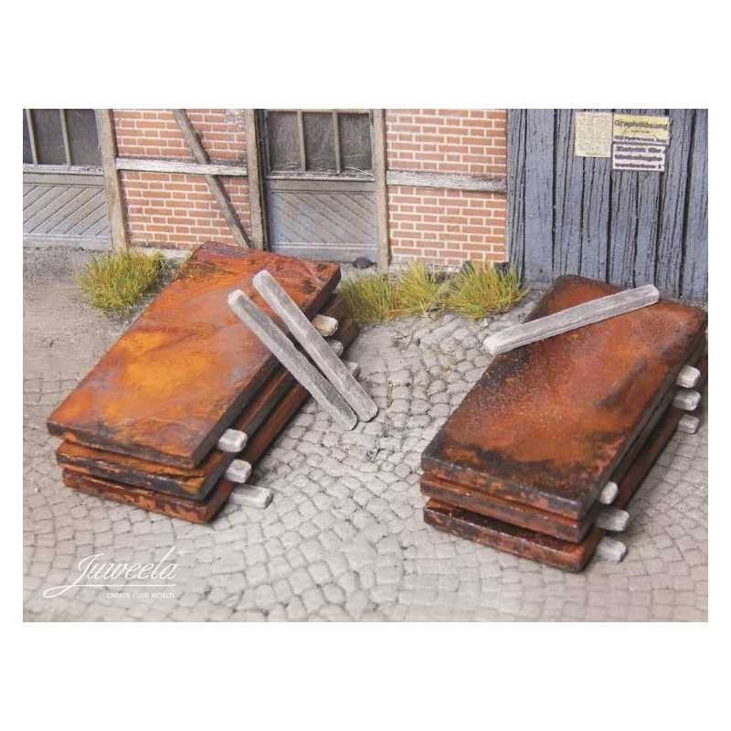Płyty i blachy surowego metalu do transportu na wagonach kolejowych lub na samochodach ciężarowych. Te zardzewiałe płyty możesz przewozić, nakładając na siebie dwie lub trzy płyty jedna na drugiej, pomiędzy nimi umieszczając drewno - i już są gotowe do transportu...