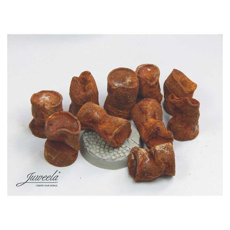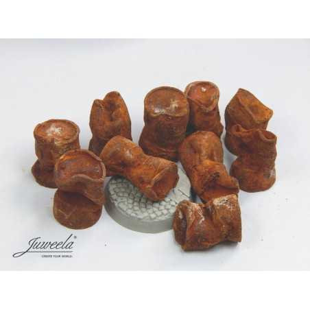 W zestawie otrzymasz dziesięć sztuk wgniecionych i zardzewiałych beczek (po olejach) w kolorowej rdzawej mieszance. Możesz użyć ich do indywidualnego zaprojektowania podstawki, dioramy, lub innego własnego pomysłu... wszystko to dla rozgrywek w skali 28 mm. Każda z beczek jest troszeczkę inaczej wgnieciona.