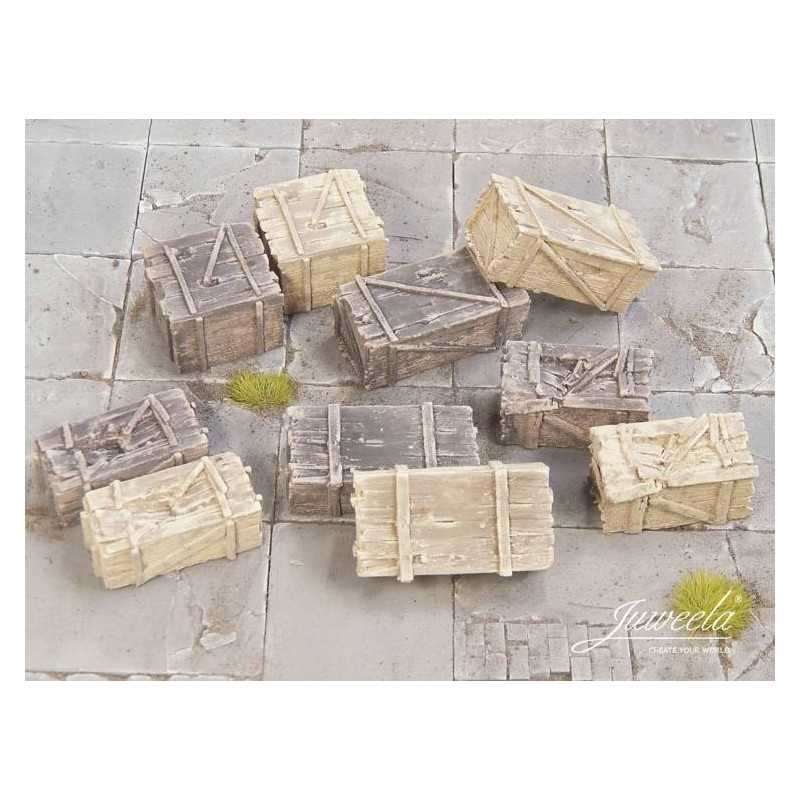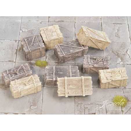pięć jasnych starych drewnianych skrzyń w skali 28 mm.