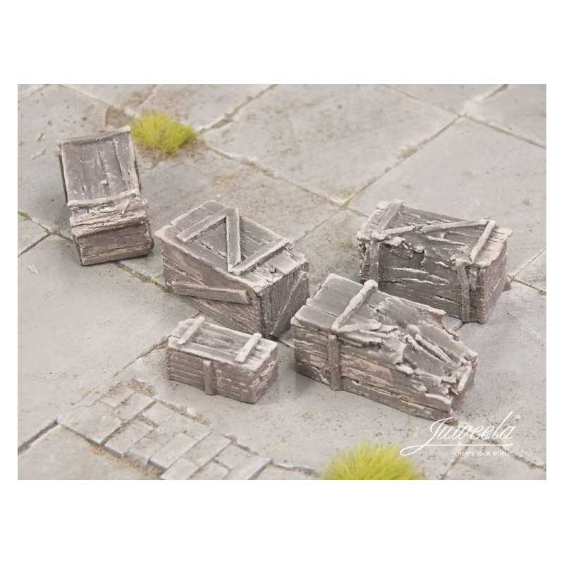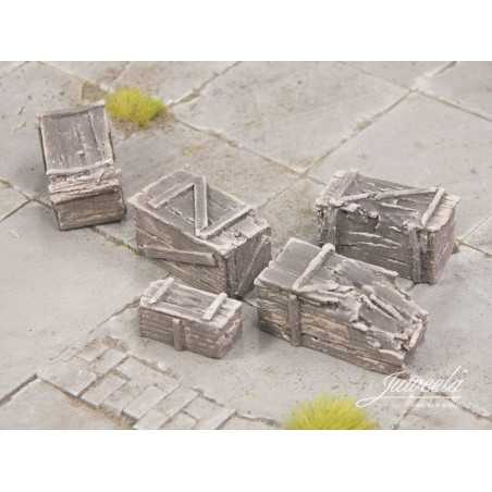 W zestawie otrzymasz pięcioro małych ciemnych oraz starych drewnianych skrzyń w skali 28 mm. Skrzynie są mocno nadszarpnięte zębem czasu. Zmontujesz z nich przeszkody w starych przejściach podziemnych czy też opuszczonych piwnicach.