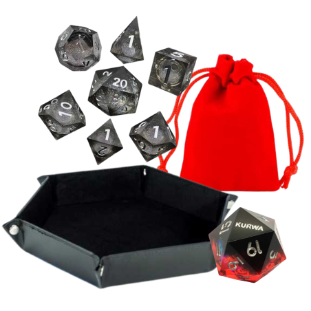 Wybierz komplet kości z tacką do rzucania, aksamitnym woreczkiem pod kolor, monetami, albo zmywalną matą. Obdaruj kogoś zestawem nietypowych kostek, które świecą w ciemności lub całym niezbędnikiem gadżetów RPG – w sam raz dla początkującego i zaawansowanego gracza!