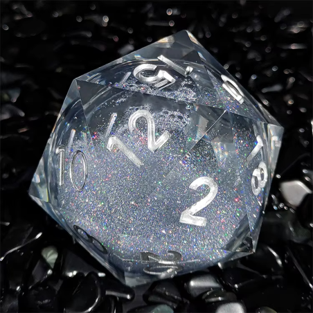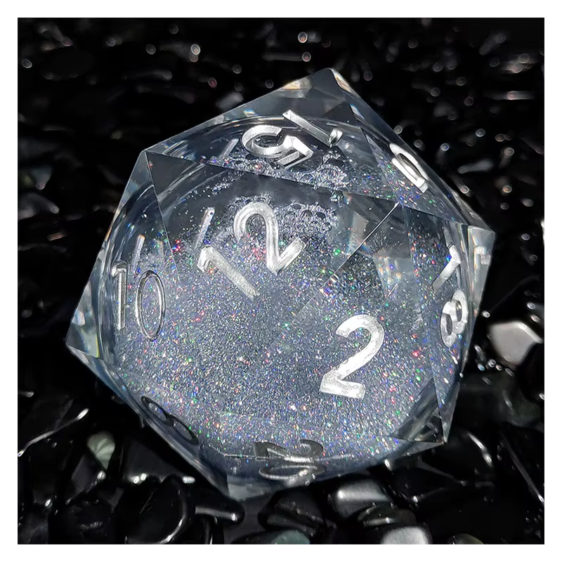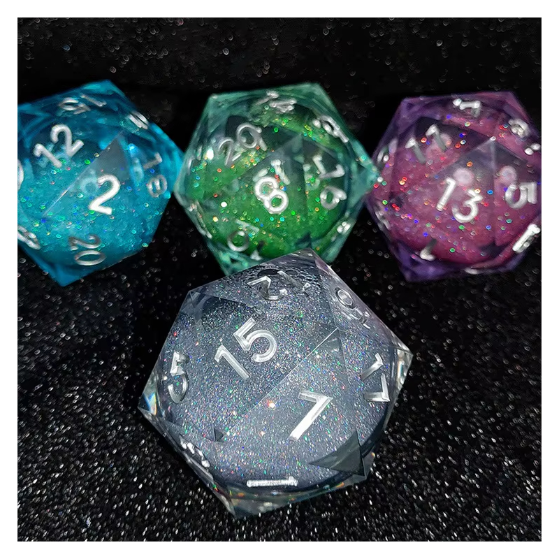 Kostki mają płynne wnętrze - po rzucie widać w nich pływający brokat.