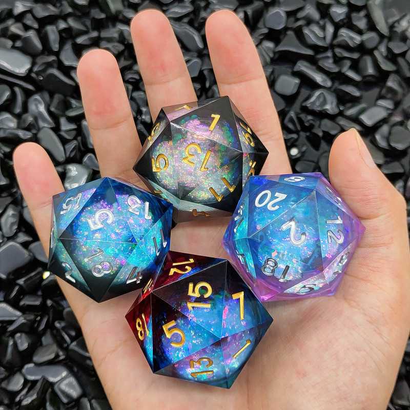 Kostki mają płynne wnętrze - po rzucie widać w nich pływający brokat.