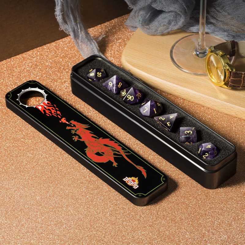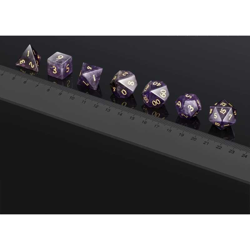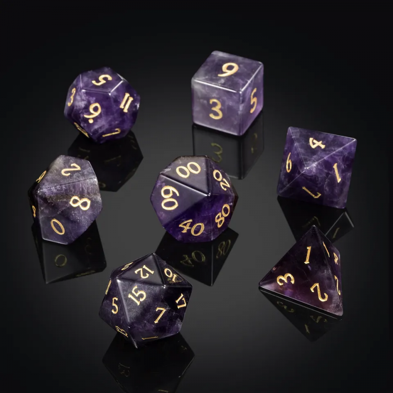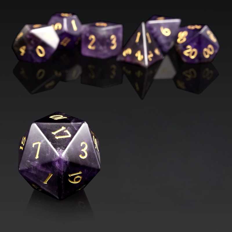 Niech Cię nie zwiedzie półszlachetność tej odmiany kwarcu, bo to kości dla prawdziwych lordów! Królewska purpura wykuta ze słupkowych struktur ametystu i ukształtowana w wielościenne bryły służy wszystkim zdroworozsądkowym arystokratom. Wszak po grecku ἀméthystos znaczy trzeźwy... w przeciwieństwie do Twoich upojonych współtowarzyszy. Ech, nigdy się nie nauczą. Ostudź ich gorące głowy, turlając kości rozważnie i romantycznie! Jesteś przecież szlachcicem, mój panie. Życzę samych dwudziestek!