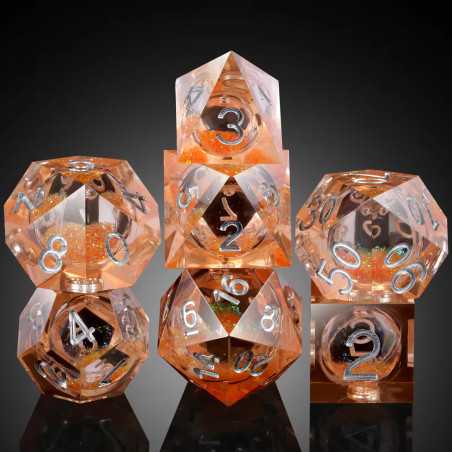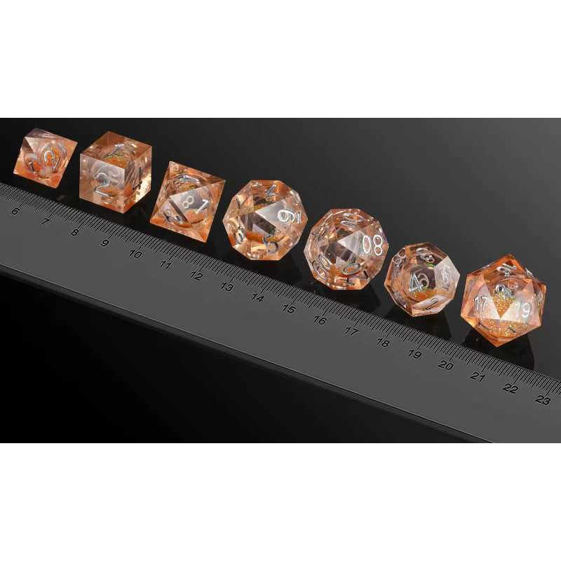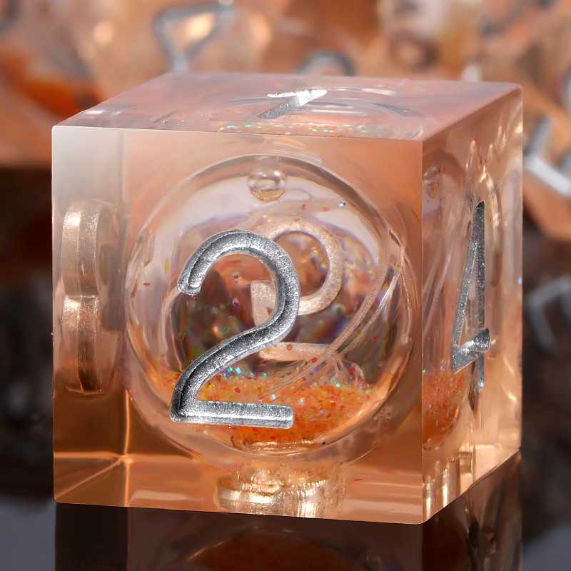Kostki mają płynne wnętrze - po rzucie widać w nich pływający brokat.