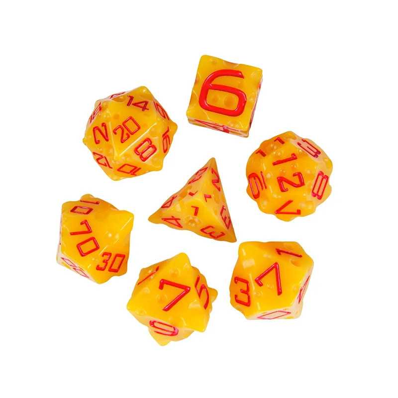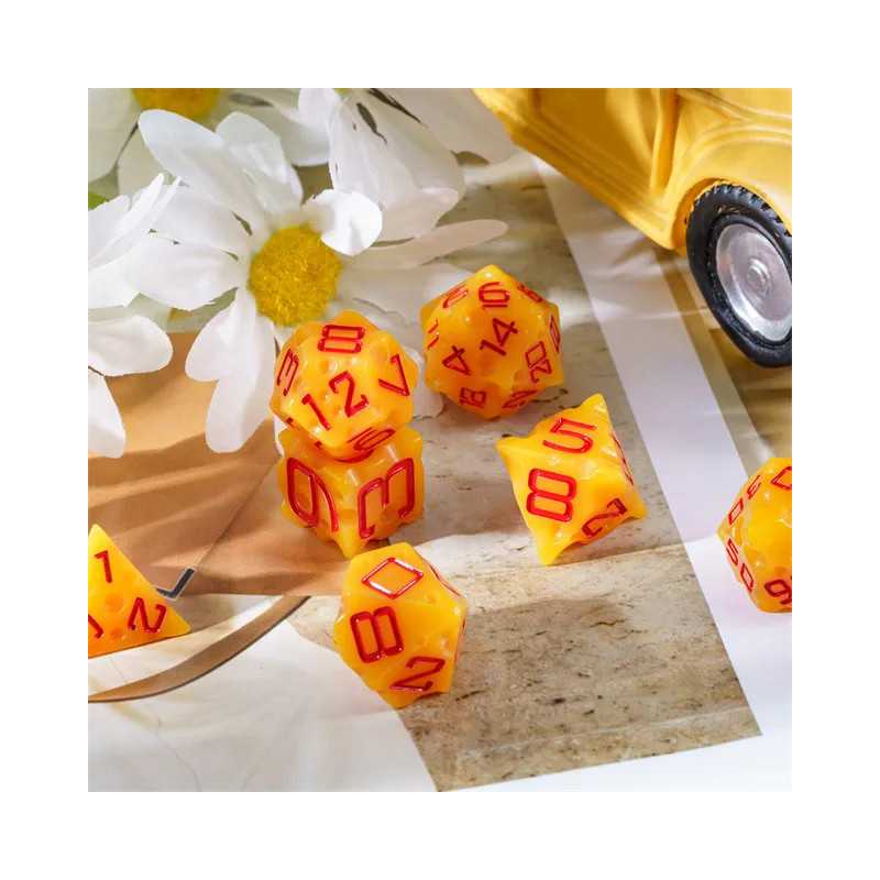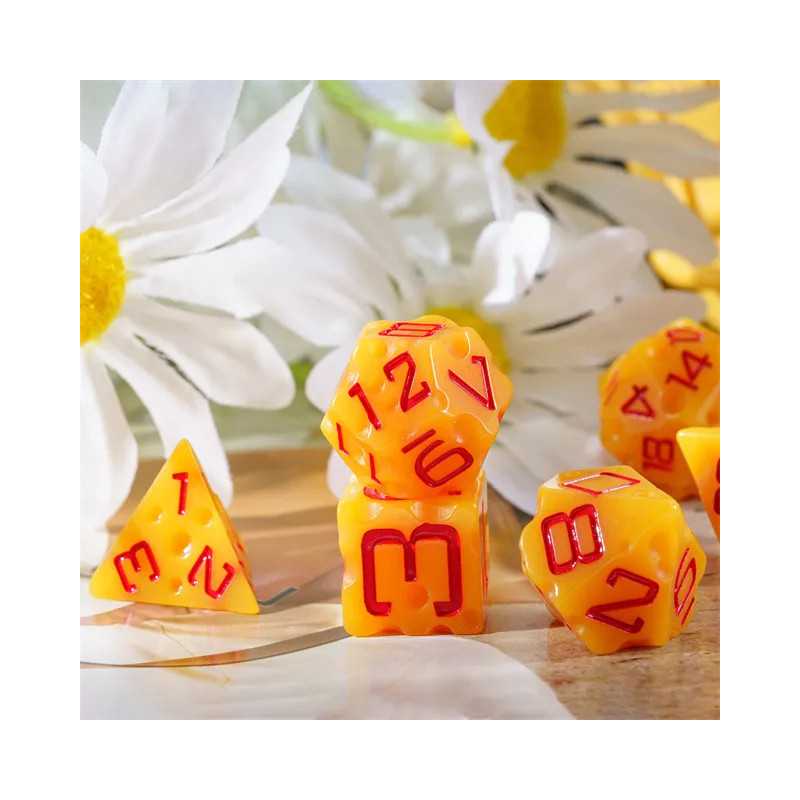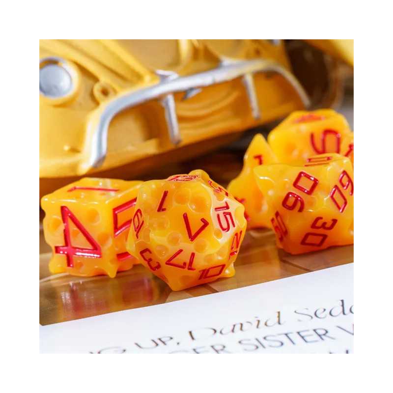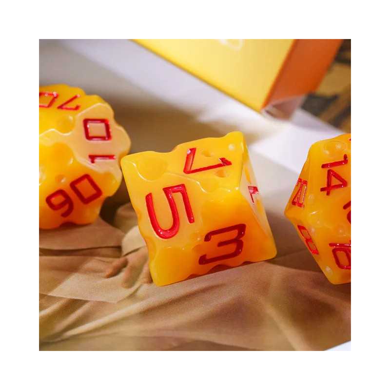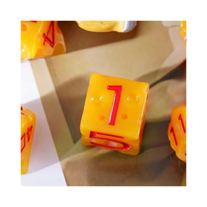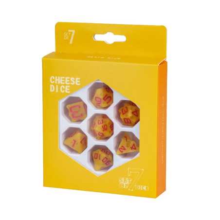 Czy słyszałeś może o legendarnej myszy sir Cheddingtonie? Swego czasu był bohaterem, pogromcą pułapek i niekwestionowanym mistrzem w wyścigu po najdojrzalszy ser w pewnej krainie, gdzie królowa myszy rządziła twardą łapką. To on odnalazł starożytny serowy artefakt - legendarny skarb Cheddar, najcenniejszy w całym królestwie. Myszy z całego świata zjeżdżały się, by spróbować szczęścia w rzutach tym cudownym zestawem kości, których tekstura przypominała najdojrzalszy cheddar, a kolor – zachód słońca nad angielskimi pastwiskami. Ale uważaj, bo każdy rzut może ściągnąć uwagę… kota! Dziedzictwem sir Cheddingtona są te pomarańczowe, serowe kości – idealne do rzucania zarówno na stole, jak i na angielskiej łące, podczas tradycyjnego turnieju w turlaniu sera. Czy i Twoja drużyna zdoła uniknąć pułapki, przeskoczyć przez łapę kociego strażnika i zatriumfować w serowym wyścigu po chwałę? Uważaj, bo na końcu tej przygody czeka nie tylko triumf, ale i solidna dawka śmiechu. Rzuć Cheddarem i sprawdź, czy los będzie łaskawszy niż angielska pogoda!