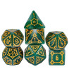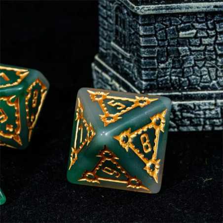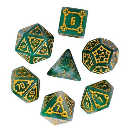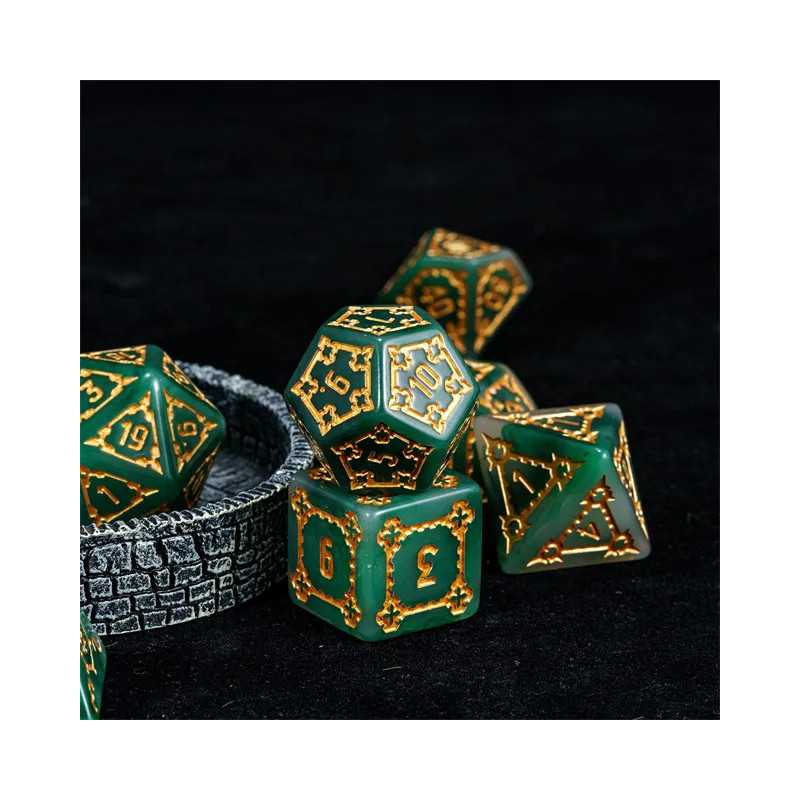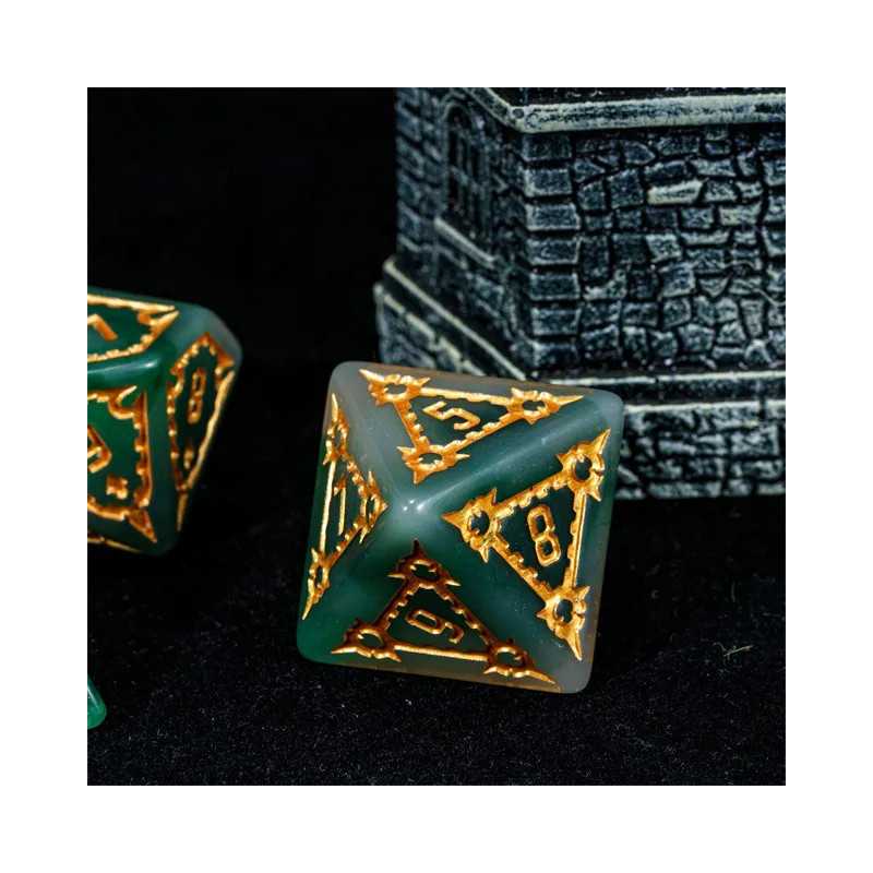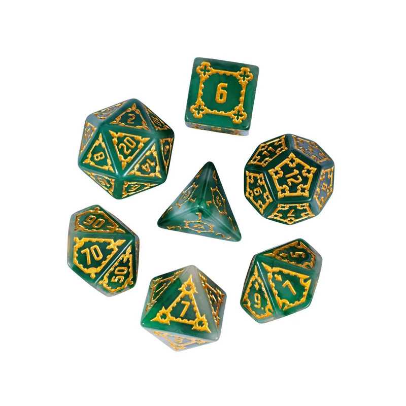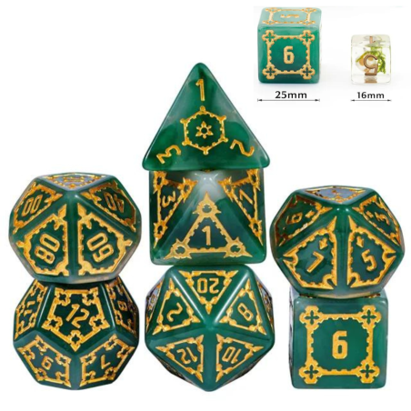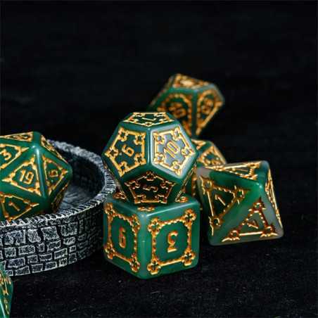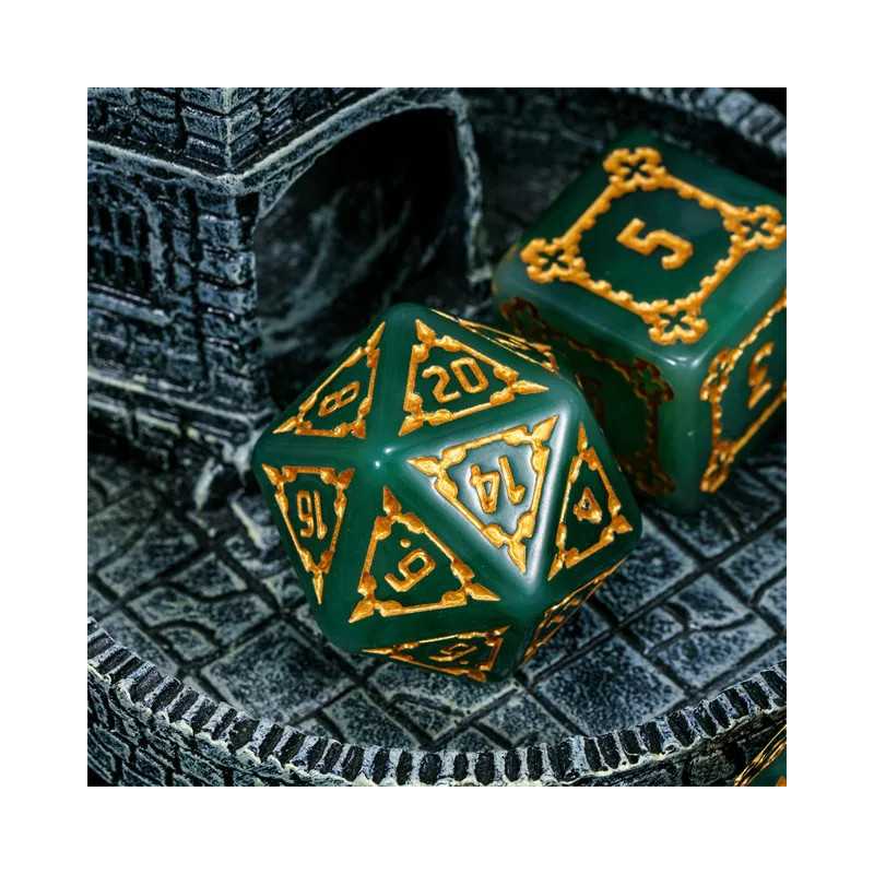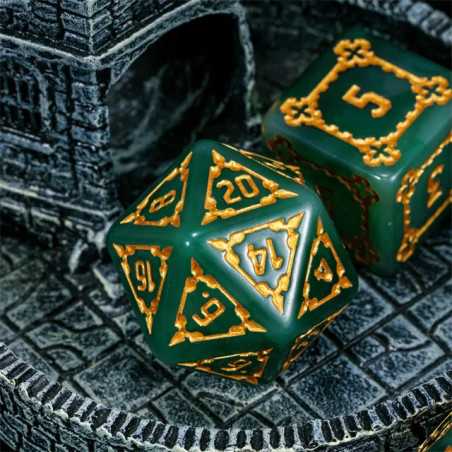 Samodzielna twierdza wznosi się wysoko ponad miastem i góruje nad budynkami zwykłych ludzi. To Cytadela, siedziba władcy i symbol jego potęgi. Zostałeś zaproszony do wnętrza jej murów jako Nadworny Budowniczy, by sprawdzić jej strukturę, wykryć słabości i ulepszyć kompleks budynków.. Przyszło Ci żyć w ciekawych czasach gnolli i bazyliszków, a los dał Ci niezwykle trudne karty do ręki. Turlaj kości losu, nakłoń wpływowe osoby w mieście do współpracy i zdobądź uznanie monarchy (gdzieś już to słyszałem). Uważaj na spiskowców, zawsze znajdą się tacy, którzy chcą obalić monarchię i uszczknąć kawałek tortu hydry dla siebie. Musisz się trzymać mocno, a pomogą Ci w tym nasze ogromne kości Cytadeli. Ciężkie i potężne jak mury miejskie, pozwolą Ci wyrzucić same krytyczne sukcesy na ścieżce budowania prosperity i obronią Cię przed ciosami w plecy. Ich zielona natura i szlachetne złocenia zostały wykonane przez samego kupca Ergiefkusa - trudno o lepszą rekomendację! Turlaj śmiało i wznoś się ponad przeciętność!