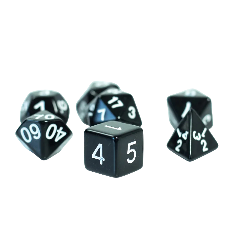 Komplet dziesięciu klasycznych, matowych kości. Niezwykle wysoka jakość odlewu, precyzja żłobienia oraz malowania numerów, czynią z nich podstawowy wybór dla wielu graczy, zarówno początkujących, jak i zaawansowanych.