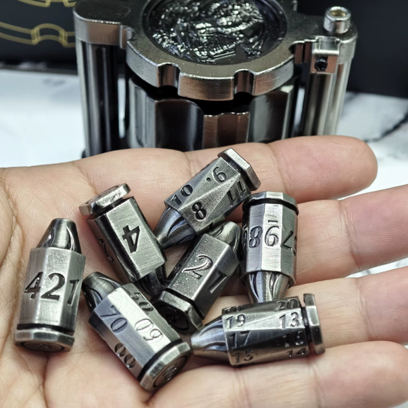 Zestawy metalowych kości do gry wyróżnia ponadprzeciętna odporność na uszkodzenia. Choć sprawiają wrażenie cięższych, są dobrze wyważone i wygodne w użyciu. To produkt wysokiej jakości, stanowiący prawdziwy niezbędnik zaawansowanego gracza. Z doświadczenia wiemy, że każdy fan tytułów RPG i planszówek w końcu decyduje się na zakup metalowych kostek. Przyczyny są dwie: wygoda i elegancki wygląd, który podkreśla wagę wykonywanych rzutów.