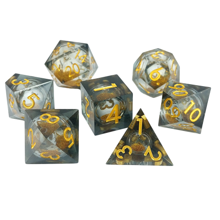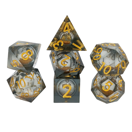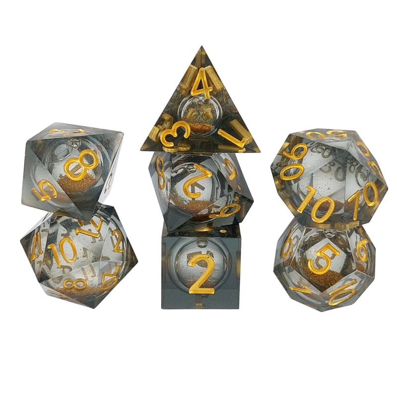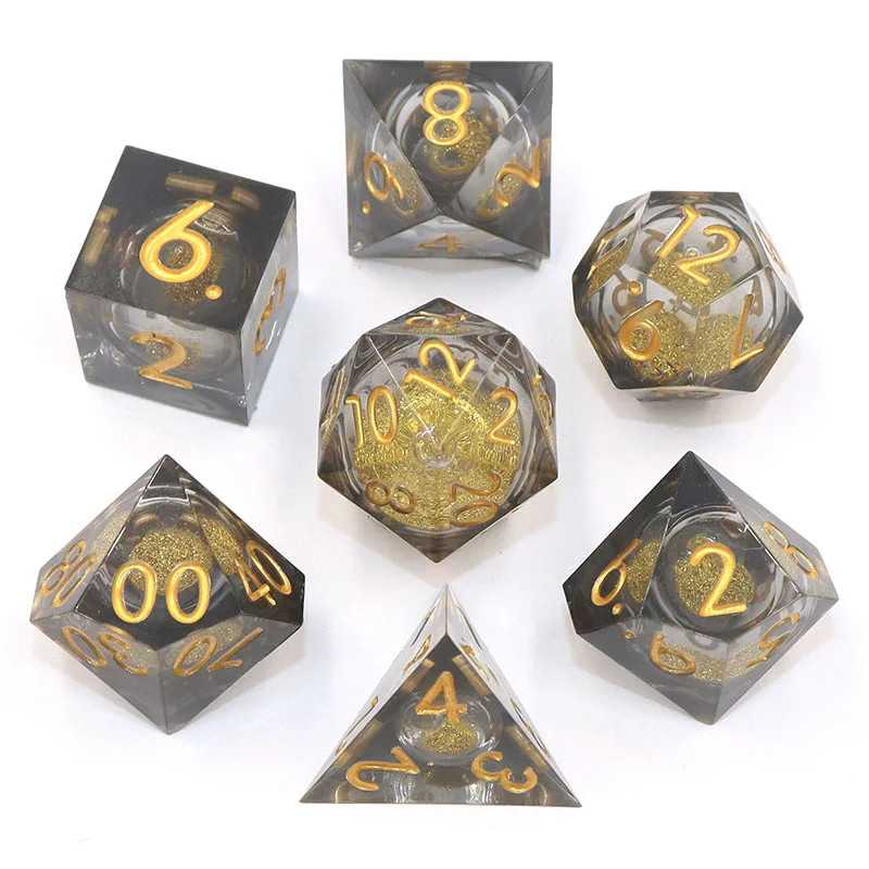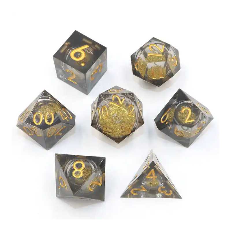 Kostki mają płynne wnętrze - po rzucie widać w nich pływający brokat.
