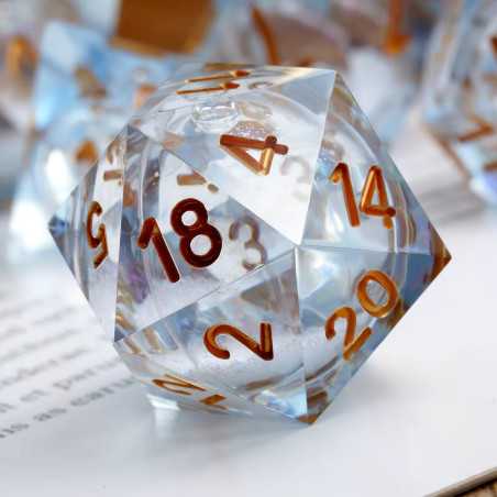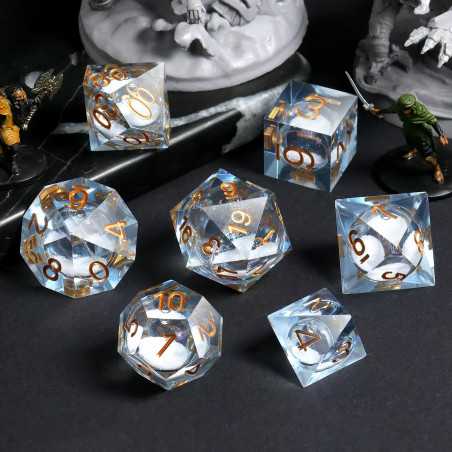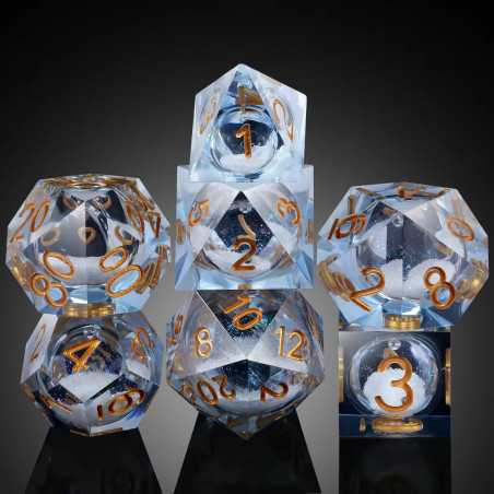 Kostki mają płynne wnętrze - po rzucie widać w nich pływający brokat.