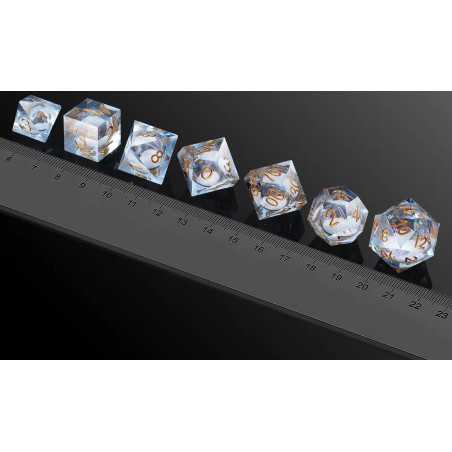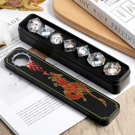 Świecące niezdrowym blaskiem zieleni węże wiją się na szkle, który trzyma w ryzach przesypujący się piasek. Serpentyny Slytherinu oznaczają zazwyczaj kłopoty, ale nie tym razem. Teraz jest inaczej, ciekawiej. Ziarenka odliczają czas spotkania towarzyskiego, ale jest haczyk. Kiedy rozmowa się układa i między rozmówcami powstaje pozytywna chemia piasek sypie się wolniej, aby leniwie spędzony czas płynął w nieskończoność. Lecz gdy wszystko wskazuje na to, że ludzie nadają na różnych falach i męczą się w swoim towarzystwie - puf! Wszystkie ziarenka szybciutko mkną na dno i czas spotkania się kończy. Idealne rozwiązanie na speed dating! Ten zestaw kostek to odprysk klepsydry Horacego Slughrona, założyciela prestiżowego Klubu Ślimaka i nauczyciela eliksirów w Hogwarcie. Kiedy wykonujesz nimi rzut przyspieszasz nudne partie sesji i zbędne przedłużanie, by dotrzeć do mięska fabuły, walki i dialogów, które trwają od teraz dłużej w świadomości graczy. Ten zestaw ratował wiele rozgrywek, które utkwiły w martwym punkcie ekspozycji i skomplikowanych zagadek. Polecane przez wszystkich czarodziejów!