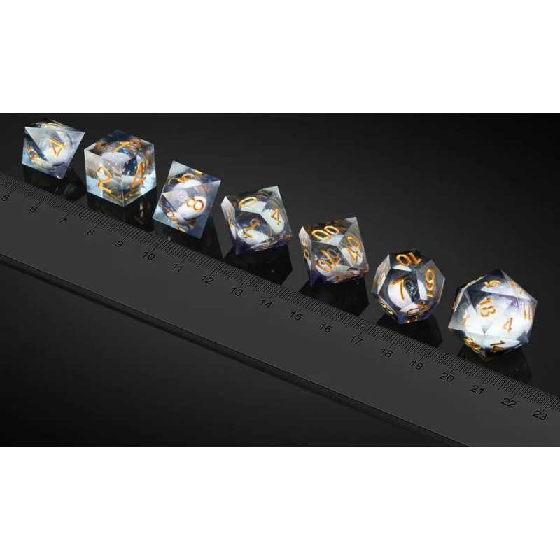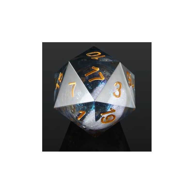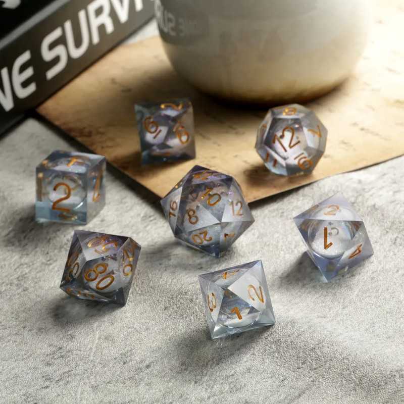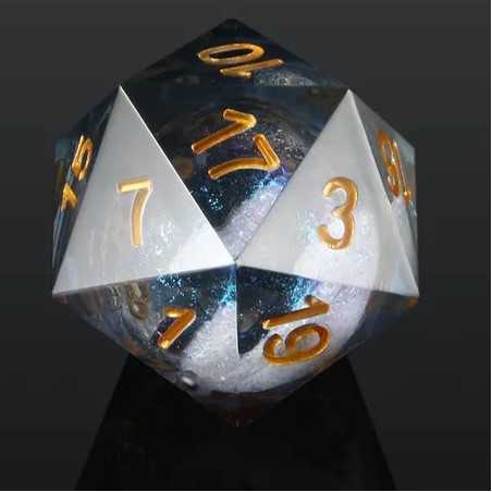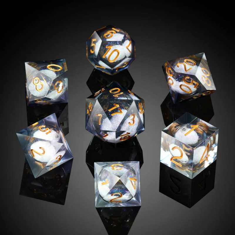 Kostki mają płynne wnętrze - po rzucie widać w nich pływający brokat.
