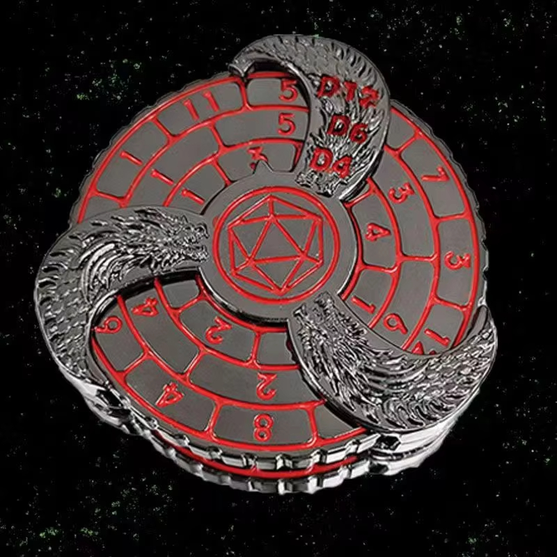 • Moc zestawu kości w mojej dłoni: Jedna strona spinnera posiada cyfry i wskaźniki dla kostek k4, k6 i k12, podczas gdy druga strona obsługuje kostki k8, k10 i k20. Dzięki temu masz wszystko, czego potrzebujesz, w jednym poręcznym narzędziu.