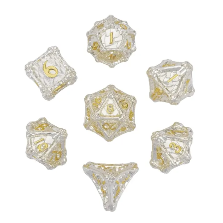 Komplet kości, czyli siedem wysokiej jakości kostek. Dzięki odpowiedniemu wyważeniu są bardzo wygodne w użyciu.