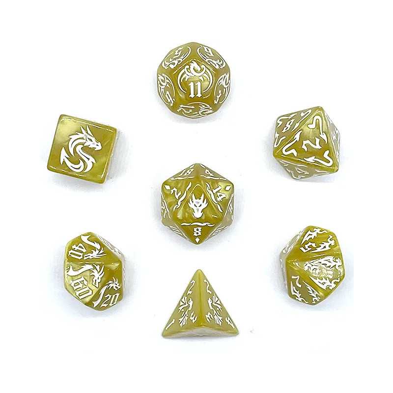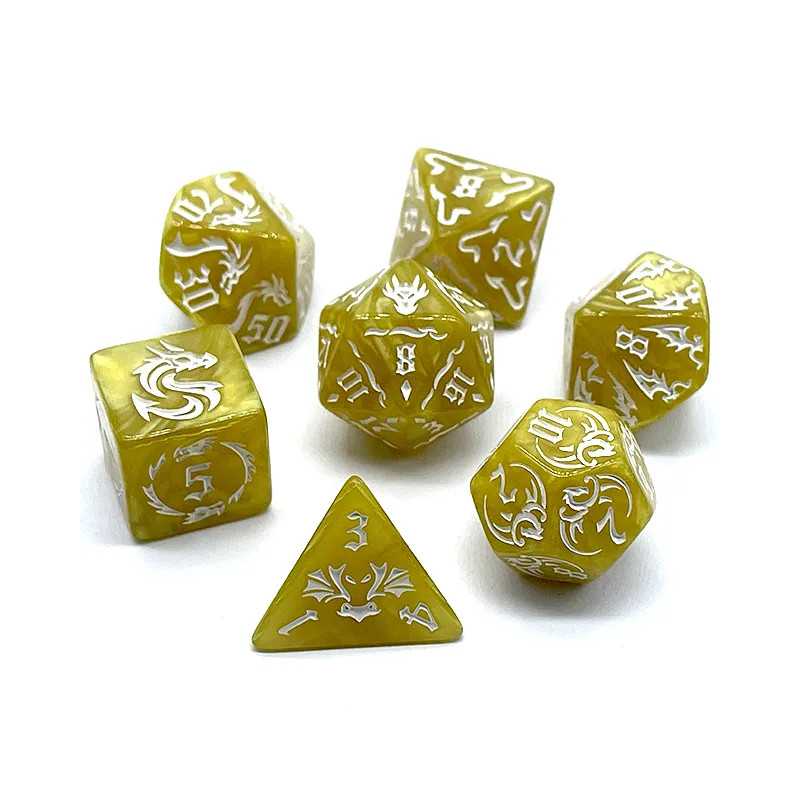 Nic się nie martw, ja też nie potrafię wypowiedzieć tego imienia, więc używajmy skrótu. Miano Aera - Gildenfire tłumaczy się jako “Złoty Ogień”, choć nosił też inne przydomki. Był złotym smokiem, o całkowicie neutralnym usposobieniu. Potrafił przemieniać się w człowieka. Osiadł w Wysokich Drzewach na północy jako Vaeros Fireshield, Smok-Druid z Mielikki i wiódł spokojne życie pośród natury. Aercio kochał debatować z innym złotym smokiem, Larethem - nazywanym Panem Sprawiedliwości, w swych czasach uznawanym za najpotężniejszego ze smoków. Czy coś z tych rozmów ostatecznie wynikało? Absolutnie nic! A mimo to cudownie było móc obserwować ich szermierkę słowną, masę argumentów, które pojawiały się znikąd i cieszyły te pocieszne fałdki wewnątrz czaszki. Ergiefkus przesiadywał w czasie rozmów na skale pomiędzy nimi i słuchał. I gdy tak słuchał, tworzył kostki dla Ciebie, zaklinając w nie bystrość złotych smoków. Ten, kto je dzierży, otrzymuje błogosławieństwo mądrości, dostrzega więcej i potrafi się pięknie wysławiać. Rosnące poczucie sprawiedliwości w cenie. Idealne dla paladynów!