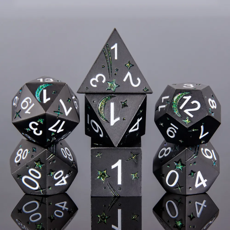 Komplet kości, czyli siedem wysokiej jakości kostek. Dzięki odpowiedniemu wyważeniu są bardzo wygodne w użyciu.