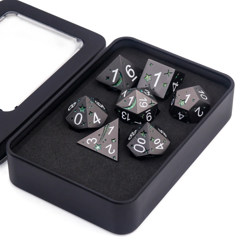 Zestaw siedmiu metalowych kości do gier fabularnych
