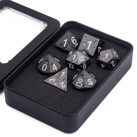 Zestawy metalowych kości do gry wyróżnia ponadprzeciętna odporność na uszkodzenia. Choć sprawiają wrażenie cięższych, są dobrze wyważone i wygodne w użyciu. To produkt wysokiej jakości, stanowiący prawdziwy niezbędnik zaawansowanego gracza. Z doświadczenia wiemy, że każdy fan tytułów RPG i planszówek w końcu decyduje się na zakup metalowych kostek. Przyczyny są dwie: wygoda i elegancki wygląd, który podkreśla wagę wykonywanych rzutów.