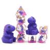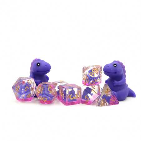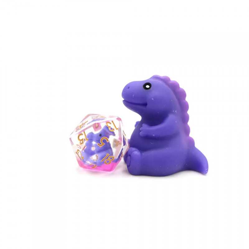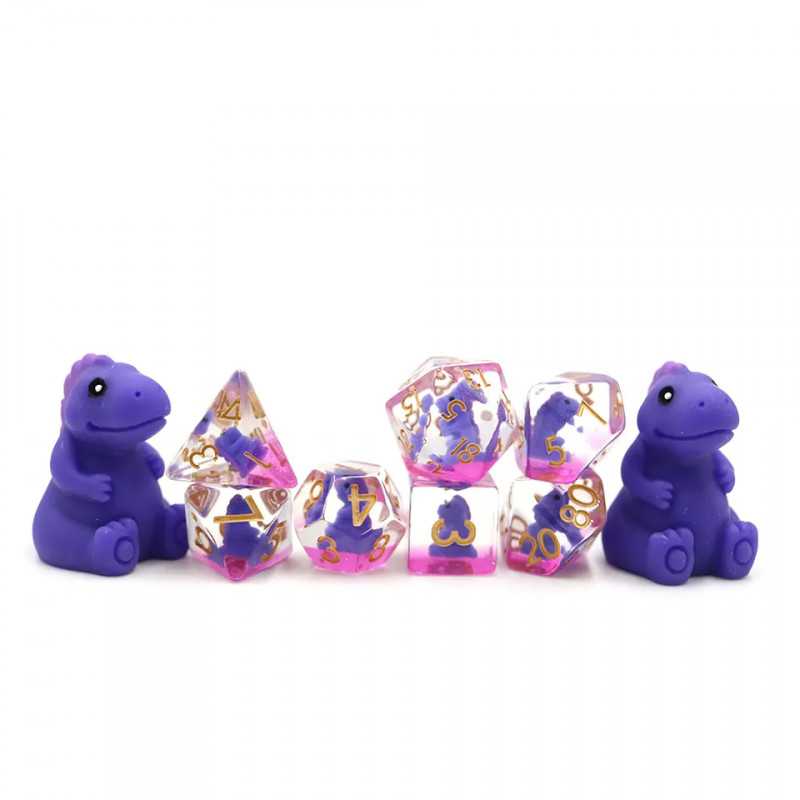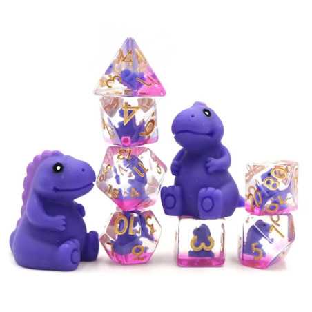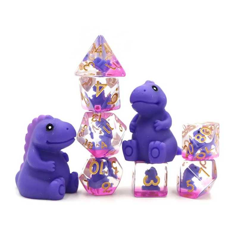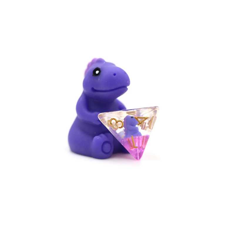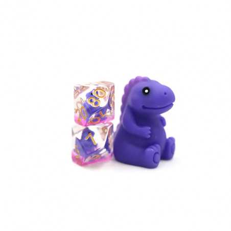 Kości przedstawiają tyranozaura. Konkretnie – Gorgosaurusa Libratusa. Mola książkowego i twórcę znienawidzonego przez uczniów Librusa. I tak, ten elektroniczny dziennik działa ociężale, bo pamięta jeszcze czasy dinozaurów. Kolejna zagadka rozwiązana! A teraz wróćmy do gorgusia, bo to uroczy miluch, który każdemu pomoże w grze i rzutach. Polecamy go na stoły! Nasz bibliofil jest niesamowicie charakterystyczny przez swoje fioletowe umaszczenie i okrągłe okularki (które zdjął na potrzeby kostek). I upodobania czytelnicze. Kocha brontromanse, dramatozaury i diplonniki literackie. Wysoka sztuka mięsa powieściowego. Ciekawostka - Gorgozaur ma jeszcze brata Albertozaura Einsteina, twórcę teorii triceratopskości. Bardzo inteligencka z nich rodzinka. Może podzielą się z Tobą swoimi sztuczkami? Przekonaj się :)