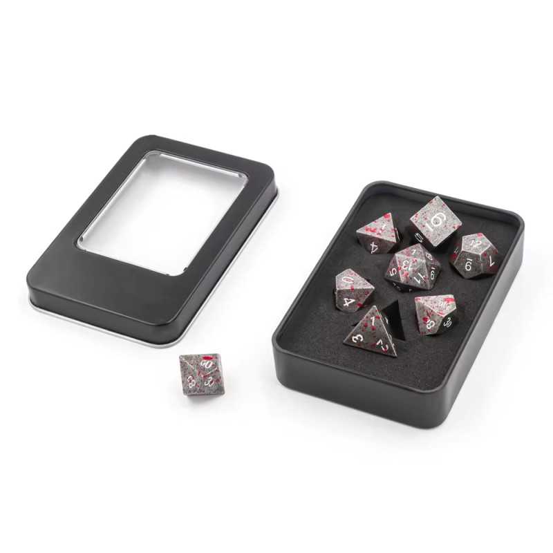 Zestaw 7 metalowych kości idealnych na sesję RPG. Kostki są zapakowane w czarne, metalowe pudełko.