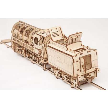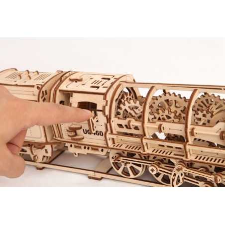 Lokomotywa i tender – wyjątkowy wagon na węgiel i wodę, ma realistyczny i niebanalny wygląd. Wszelkie elementy tego modelu takie jak zawory, tłoki, asynchronicznie poruszane z zastosowaniem ruchomych prętów, powiązań i korb koła – niosą duszę dziewiętnastowiecznej myśli inżynierskiej. To właśnie wtedy lokomotywy były dominującym elementem nurtu postępu technicznego. W tamtym czasie rozwinięte kraje zażarcie konkurowały ze sobą, jeśli chodzi o budowę maszyn parowych. Nasz model drewniany był wielkim hitem podczas kampanii w 2015 roku na Kickstarter. Jest to największa, bogata w detale, najbardziej wyszukana konstrukcja z całej gamy produktów UGEARS. Model składa się z ogromnej liczby elementów.