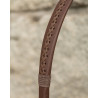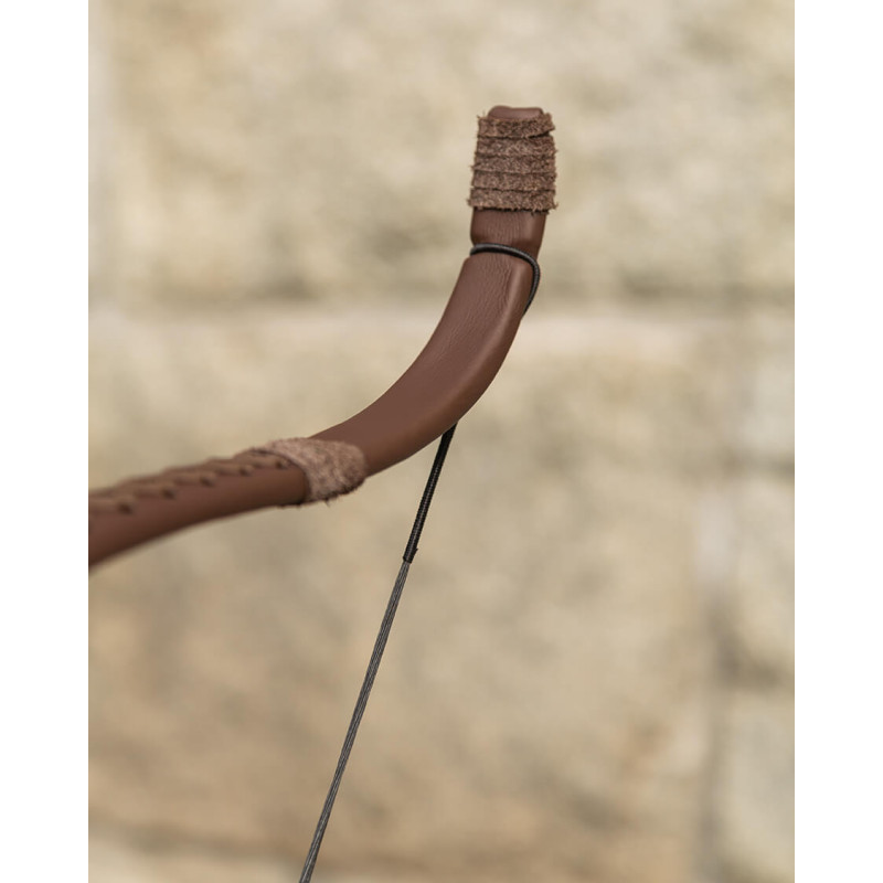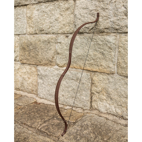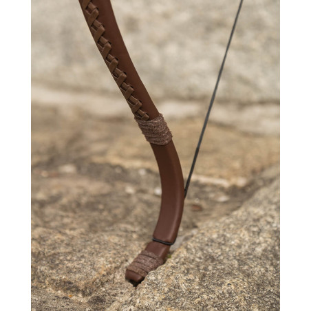 Ładny łuk LARP wykonany z włókna szklanego. Całkowicie owinięty w zamszową skórę i ozdobiony w przodzie plecionym wzorem z pasków skóry.