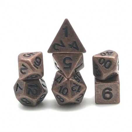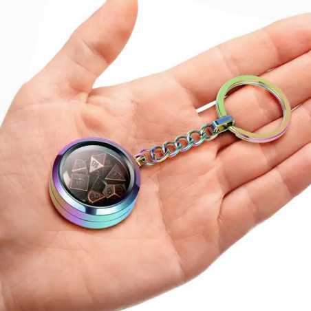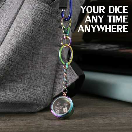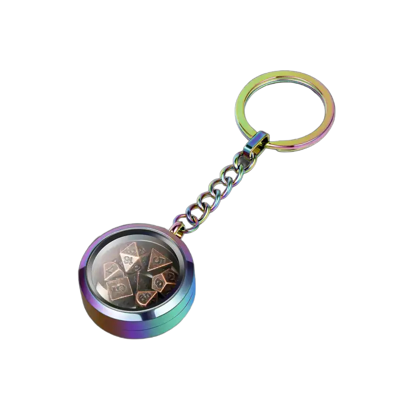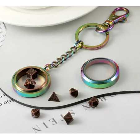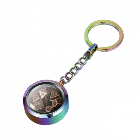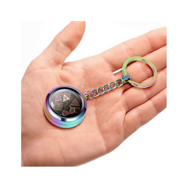 Zestaw zawierający 7 malutkich, metalowych kości RPG oraz metalowy breloczek do wygodnego transportu kostek.