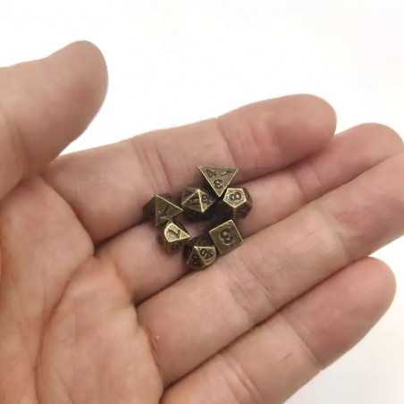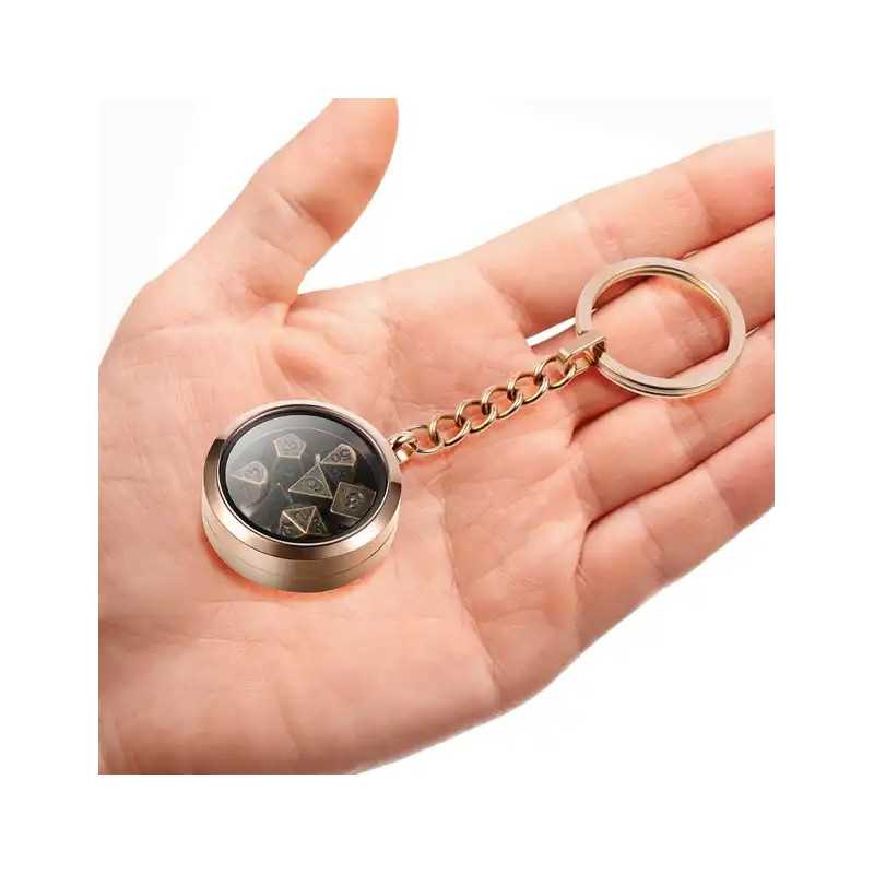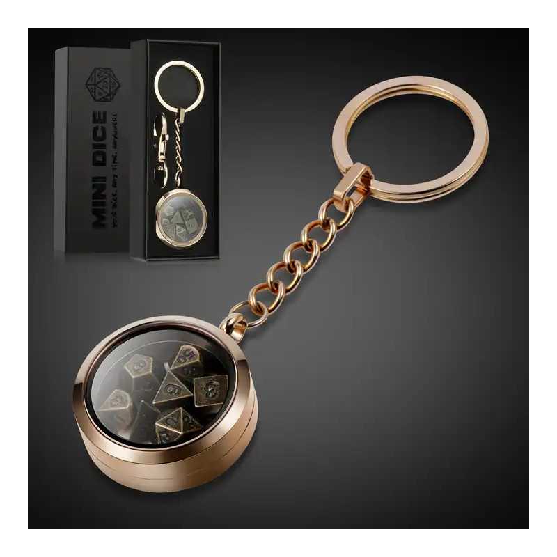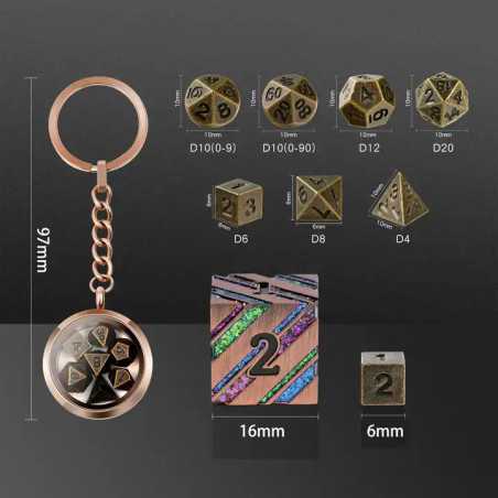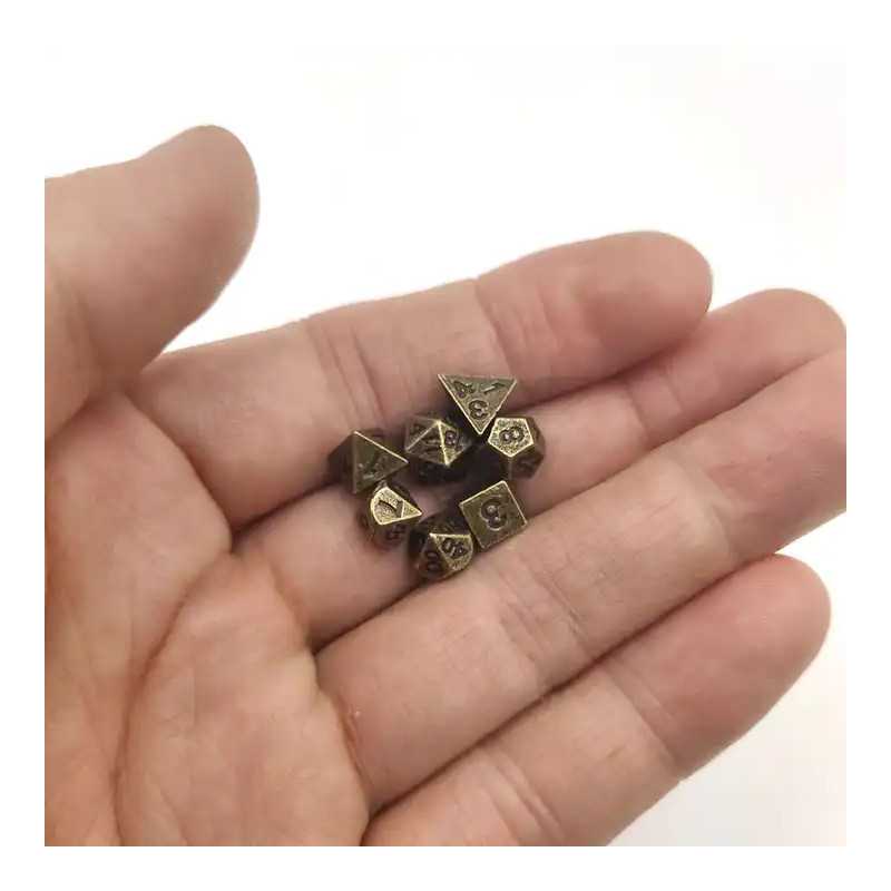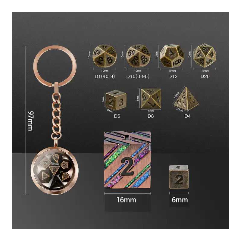 Zestaw zawierający 7 malutkich, metalowych kości RPG oraz metalowy breloczek do wygodnego transportu kostek, a to wszystko zamknięte w eleganckim pudełku. Perfekcyjny prezent dla fana gier fabularnych!